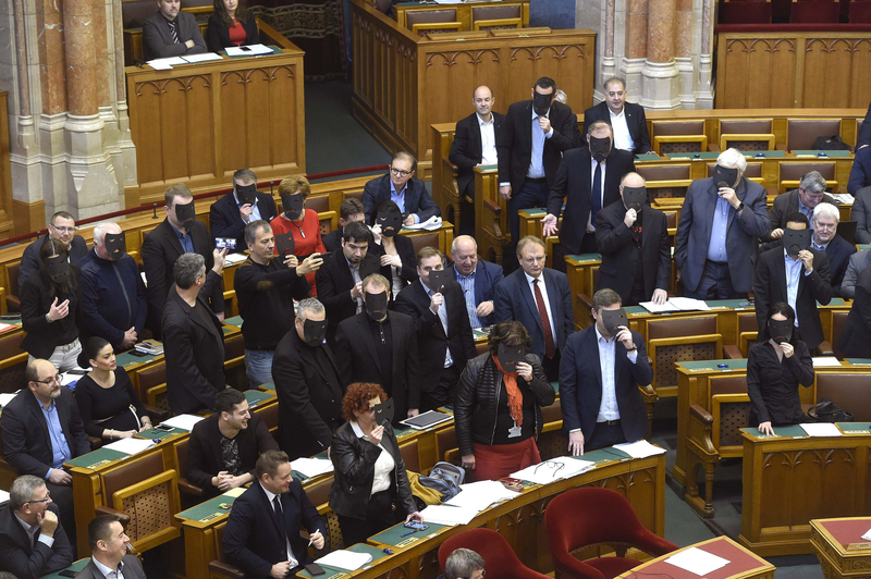 Párbeszédes, MSZP-s és DK-s képviselők a szavazás alatt tiltakozásul felálltak, és fekete maszkot tartottak az arcuk elé.