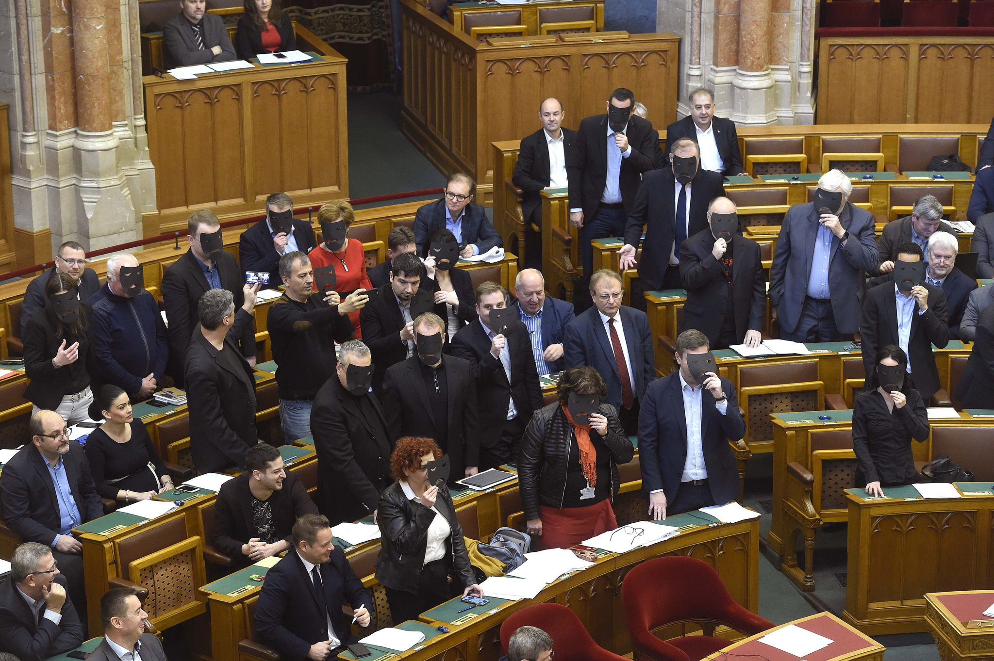 A DK, az MSZP és Párbeszéd képviselői (b-j) a kulturális törvénycsomag szavazása közben tiltakozásul felállnak és fekete maszkot tartanak az arcuk elé az Országgyűlés plenáris ülésén 2019. december 11-én. A parlament 115 igen, 53 nem és 3 tartózkodó szavazattal jóvá hagyta a kormány kulturális törvénycsomagját, amely állami, önkormányzati és közös fenntartású színházak létrejöttét teszi lehetővé. MTI/Bruzák Noémi
