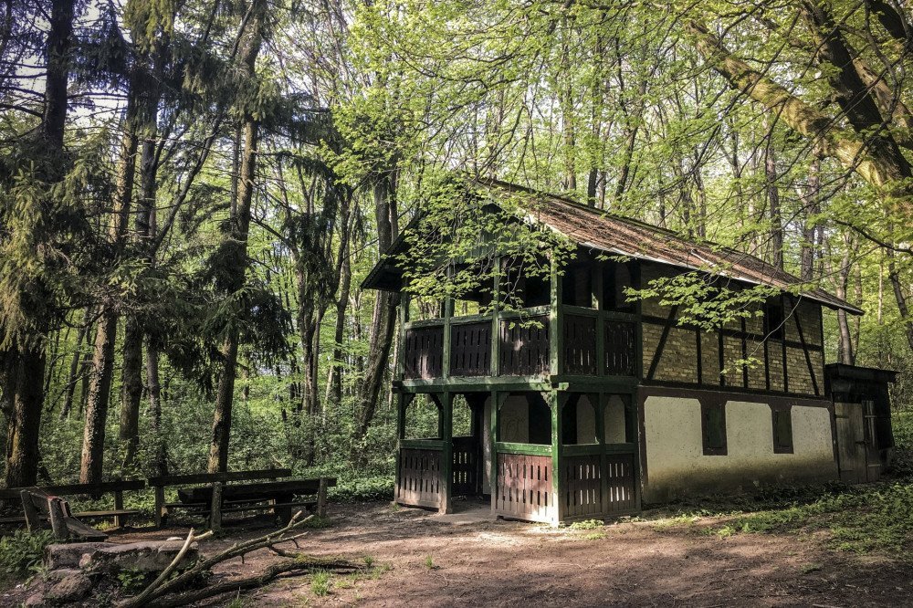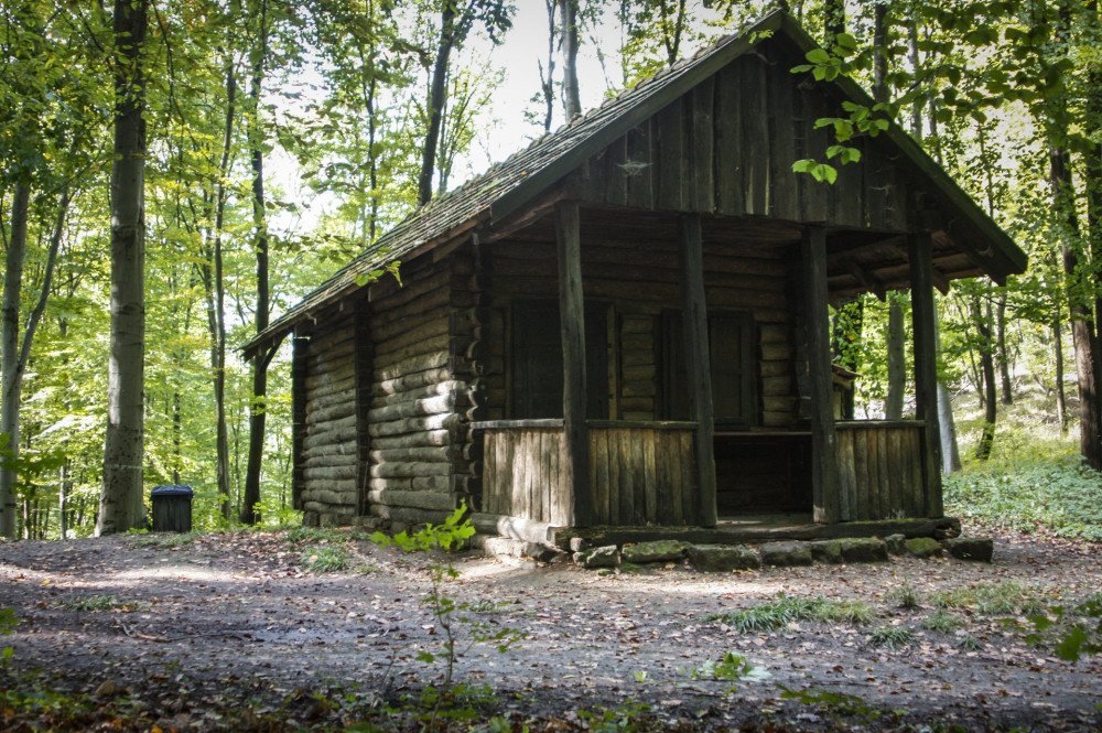 10. Egy pilisi tisztáson, a Vaskapu-sziklához közel áll ez a tömzsi, nyers gerendákból összerótt esőház. Ha a környéken fejvesztő működött volna valaha, pont ilyennek képzelném a bakó kuckóját, aminek sötét sarkában a falnak támasztott bárdról halkan csöpög le a... Brrrrr... Egyszer régen kincset kerestünk a közelében.