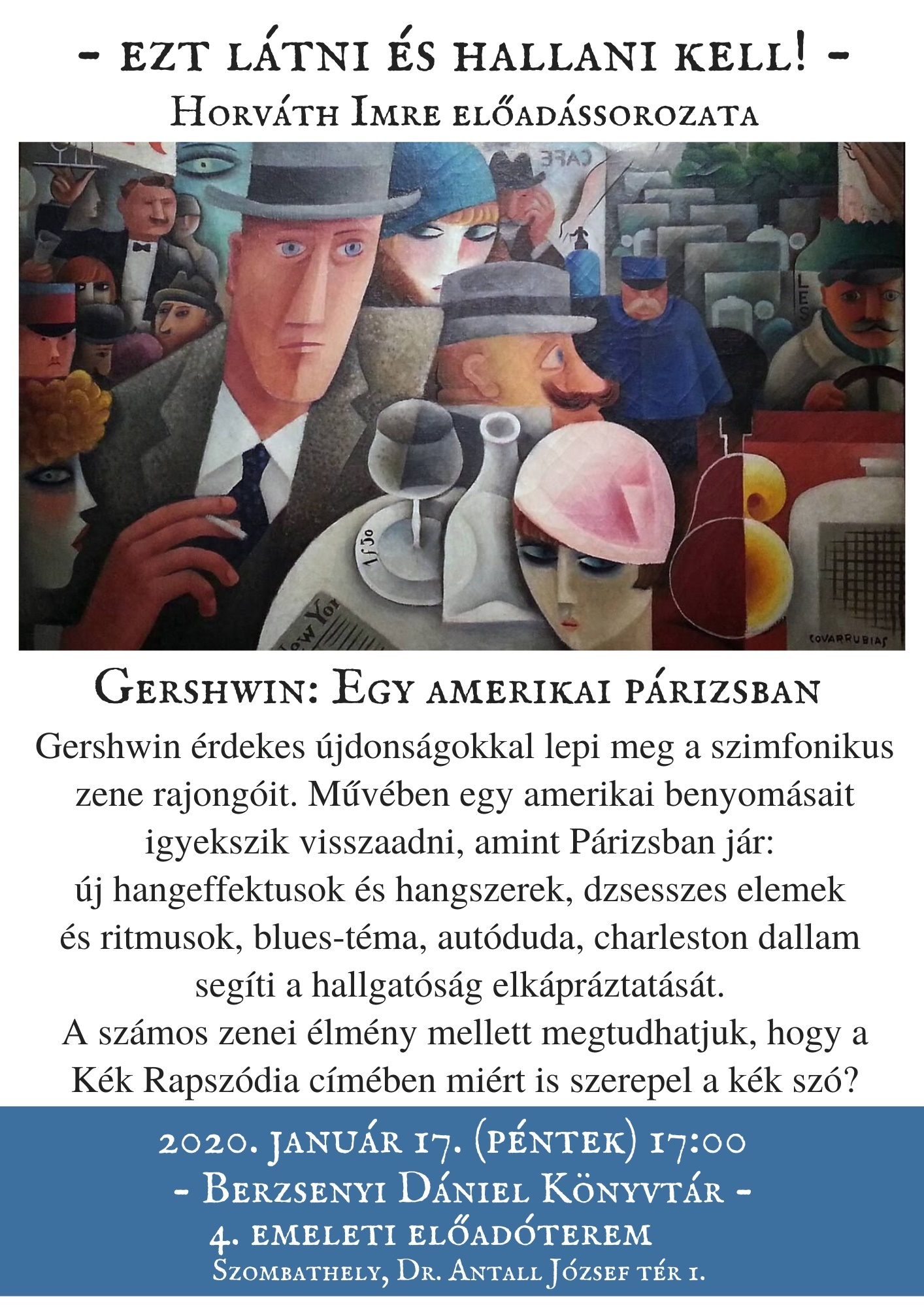 A Berzsenyi Dániel Könyvtárban január 17-én 17 órától folytatódik Horváth Imre karnagy komolyzenei előadássorozata. Ezt látni és hallani kell - Gershwin: Egy amerikai Párizsban zenéjén keresztül. A sorozat témái mindig igazodnak a szombathelyi Savaria Szimfonikus Zenekar aktuális előadásaihoz.