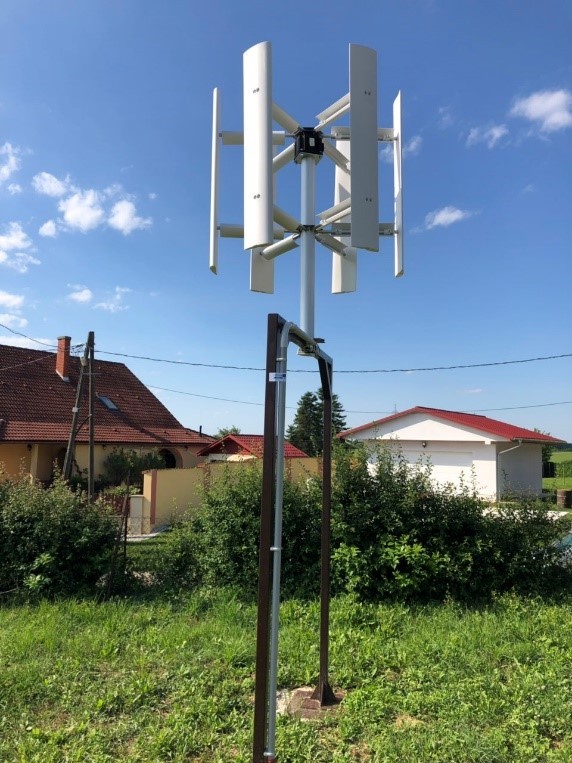 Az udvaron kihelyezésre került egy 1 kilowatt teljesítményű vertikális szélgenerátor, ami az áramtermelésben segít. A szélgenerátor a szél által keltett forgó mozgást alakítja át energiává, amellyel egy egyenáramú generátort hajt meg, így elektromos áramot állít elő. Az így előállított 12 V feszültségű villamos energiát 2 hosszú élettartamú 12 voltos akkumulátor segítségével lehet tárolni és igény szerint bármikor felhasználni - azaz elektromos berendezéseket (pl.: világítás) üzemeltetni vele.