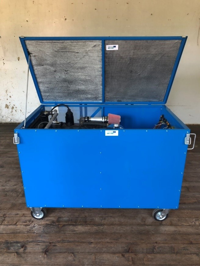 A 220 voltos áram termelésben segít még egy mobil növényi olajjal táplált mini erőmű is. Ez gyakorlatilag úgy működik, mint egy személygépkocsi motorja, amely 1900 cm3-es mechanikus adagolású diesel motor, ami képes használt növényi olajjal is működni. A motor egy általa meghajtott generátor segítségével alakítja át a mozgási energiáját elektromos árammá. A dízelmotor feltöltött, teli tankkal (kb. 5 liter) nagyságrendileg 16 órát képes üzemelni. A növényi olajjal táplált mini erőmű 2 db nagyteljesítményű flex gépet is ki tud szolgálni elegendő árammal.