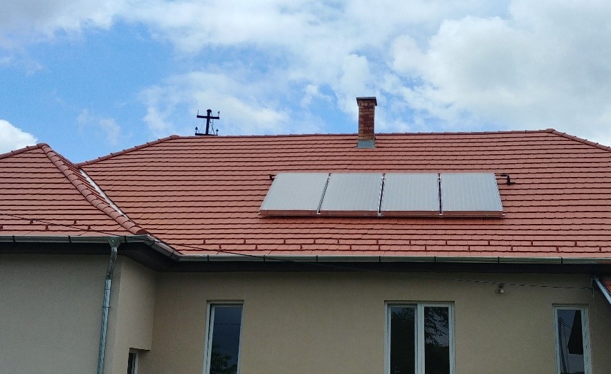 A tetőre 4db, összesen 2,5 m2 sík panel került telepítésre, ami szigetelt hidraulika rendszeren keresztül csatlakozik egy energiatakarékos keringető szivattyúhoz. A rendszerhez kapcsolódik még egy 550 literes víztartály, valamint egy szolár vezérlőegység.