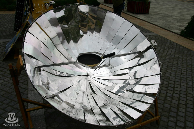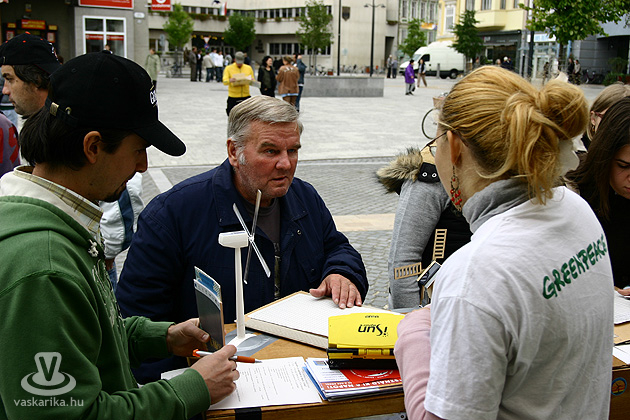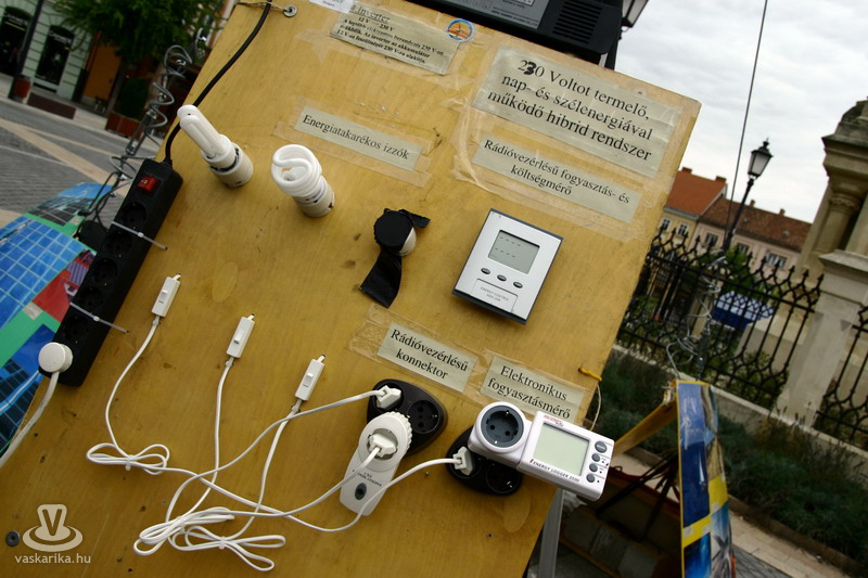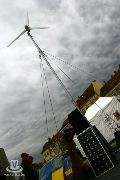 Az országjáró túra petíciójának aláírása mellett lehetőség nyílt a megújuló energiaforrásokról - mind a szél, mind a napenergia használatának lehetőségeiről - is tájékozódni a téma iránt érdeklődőknek. Környezettudatos szerkesztőség lévén - lásd még: Critical Mass bringás körmenet - kimentünk a Fő térre, hogy kicsit jobban belekóstoljunk a zöldbéke világába, s már messziről kiszúrtuk a sátor mellett felállított, hét méter magas szélturbinát. A Szentháromság szobor árnyékában felállított installáció - a szélturbina mellett - egy komplett napelemes rendszert is szemléltetett. Amíg ott tartózkodtunk, értőbb "szakik" már közelebbről is vizsgálták, vajon össze lehet-e ilyesmit hozni a fészerben található régi generátorból és a Robi kapálógép maradékából.