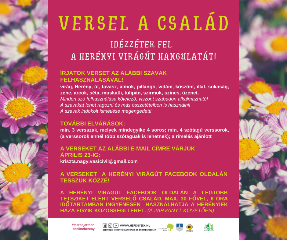 Versel a család címmel egy másik felhívást is közzétett a Herényiek Háza: az alábbi szavak felhasználásával (virág, Herény, út, tavasz, álmok, pillangó, vidám, köszönt, illat, sokaság, zene, arcok, séta, muskátli, tulipán, szirmok, színes, üzenet) kell egy verset írni az alkotni vágyóknak. Minden szó felhasználása kötelező, viszont szabadon alkalmazható, így azokat lehet ragozni és más összetételben is használni. A szavak indokolt ismétlése is megengedett. További elvárás a minimum 3 versszak, melyek mindegyike 4 soros; valamint minimum 4 szótagú verssorok, (a verssorok ennél több szótagúak is lehetnek); emellett a rímelés ajánlott. A műveket április 23-ig lehet leadni a e-mail címre, a versek pedig megjelennek a Herényi Virágút Facebook-oldalán is. A legtöbb lájkot szerző alkotó a Herényiek Háza ajándékát kapja.