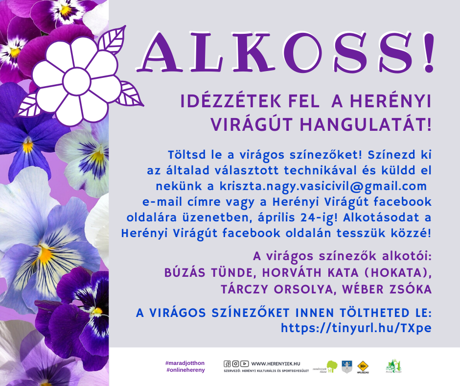 Április 20-tól a Herényi Vírágút weboldalán valamint Facebook-oldalán változatos tartalmakkal várja az érdeklőket az egyesület. Képzőművészek virágos színezőkkel csatlakoztak a kezdeményezéshez: a kicsik és nagyok számára egyaránt letölthető színezőket bármilyen technikával ki lehet színezni, a beküldött alkotásokat bárki megtekintheti majd a Virágút felületein.