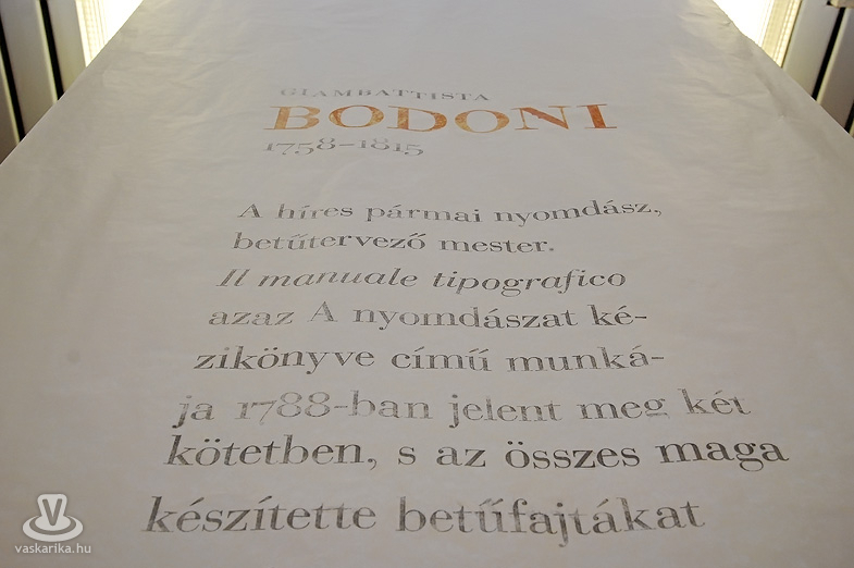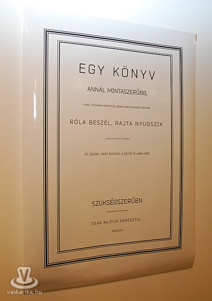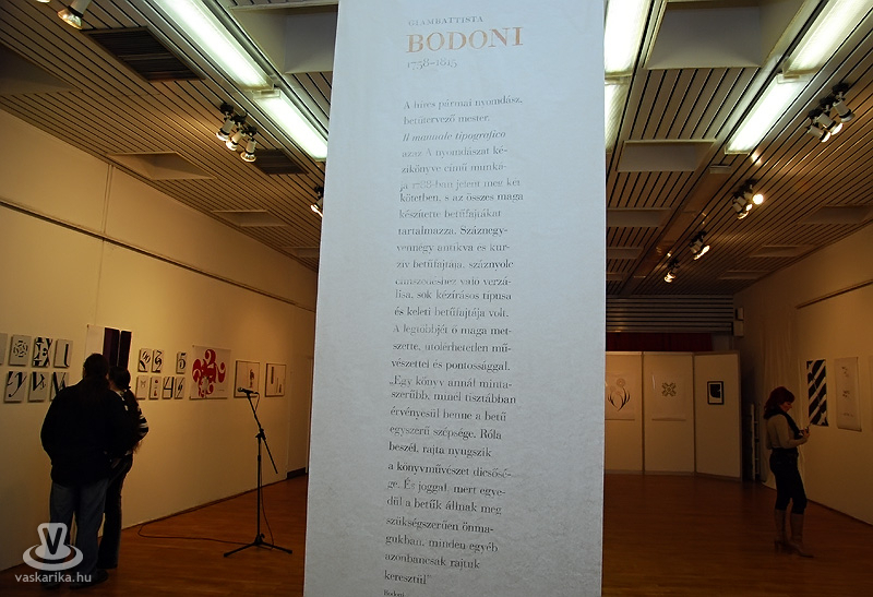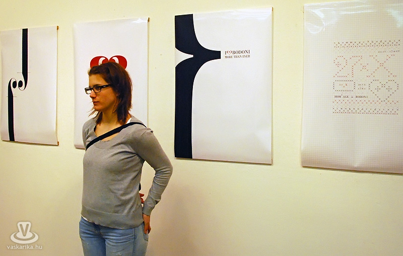 A letisztult formavilágot, a vizuális harmóniát és rendet, illetve az absztraktot kedvelők körébe tartozóként, már beléptünkkor egyből tudtuk, hogy jó helyen járunk. A terem falain, és a térben szem- és figyelemcsalogató, - mit csalogató, követelő! - alkotások sorjáztak, egytől-egyig. A megnyitó előtt még volt időnk körbejárni, és szemlélődni, és azt kell mondjuk, hogy amit láttunk, teljes mértékben lekötötte a figyelmünk. Tette ezt úgy, hogy ezzel szépérzékünket kenegette a legfinomabb balzsamokkal. Szinte teljesen mindegy lett volna, hogy egy adott alkotás hova kerül, hisz a séma és a téma ugyanonnan eredeztethető. Egy nem annyira közismert, ám ahogy kiderült, nagyon jelentős mesterre emlékeztek, illetve emlékének tisztelegtek a Nyugat-Magyarországi Egyetem Soproni Faipari-Mérnöki Kar Alkalmazott Művészeti Intézetének hallgatói, név szerint az itáliai Giambattista Bodonira. Nevezett grafikus, nyomdász és tipográfus mester volt, 1740-ben született és 1813-ban halt meg. Jelentős történelmi időszakban, a felvilágosodás és az ipari forradalom korában élt, és ennek a kornak máig is működő örökséget adott, az általa megrajzolt betűtípusokkal, könyvkötészeti stílussal és módszerrel. Stílusára jellemző az addig közkedvelt cikornyák teljes száműzése, az arányokkal való hatás a teljesen egyszerű felületeken, ahol maguk az írásjelek és sorok adják meg a látvány sava-borsát. Mai nyelvre lefordítva a machintosi letisztultság egyik lehetséges példaadója lehetett Bodoni mester.