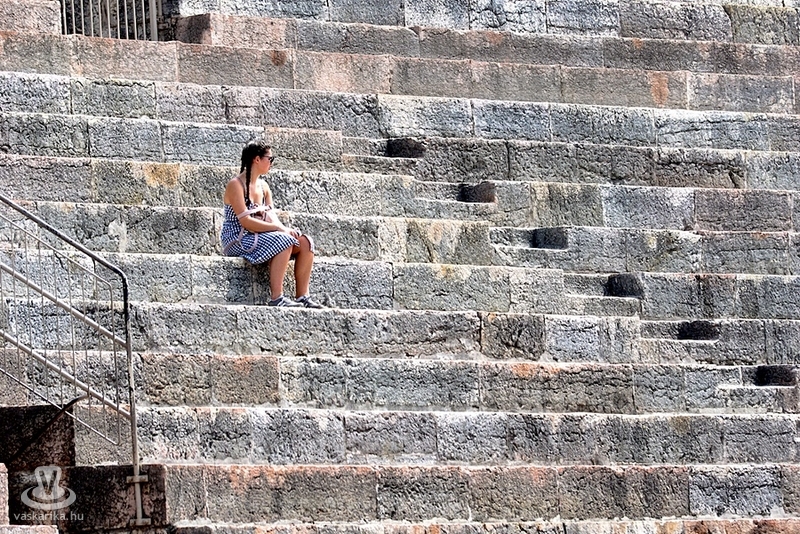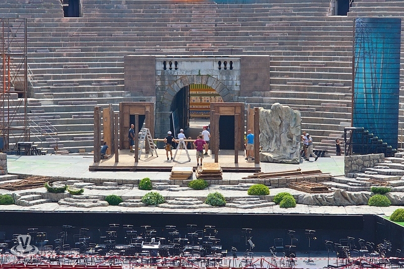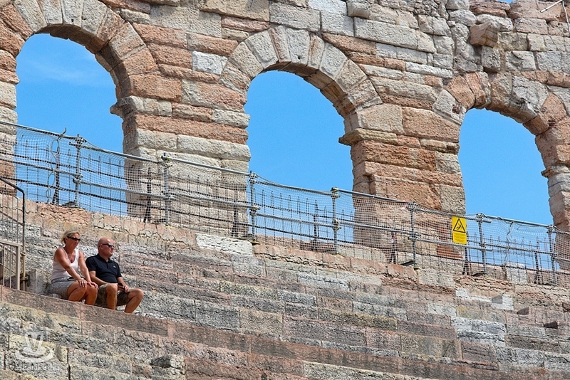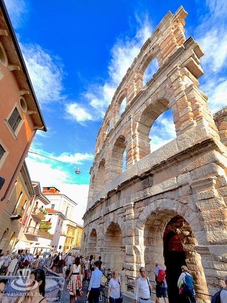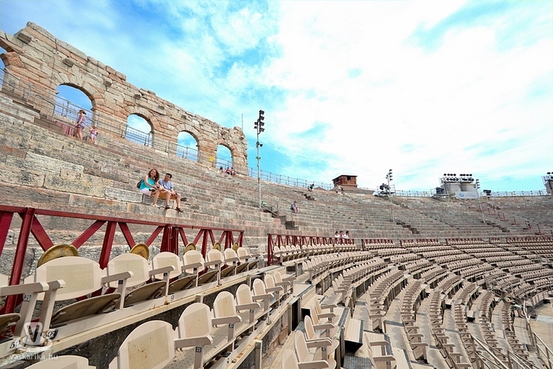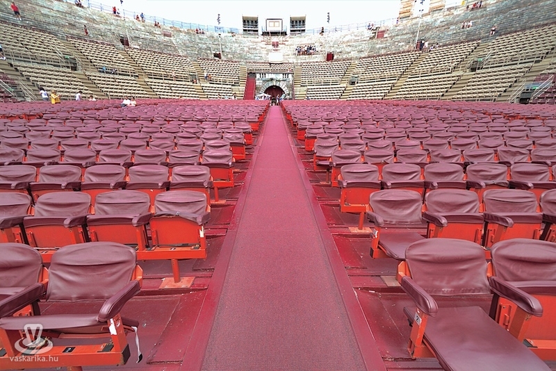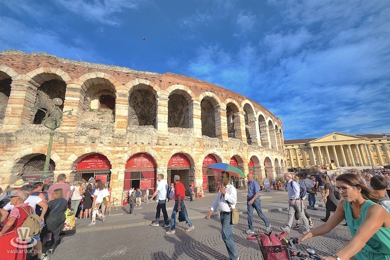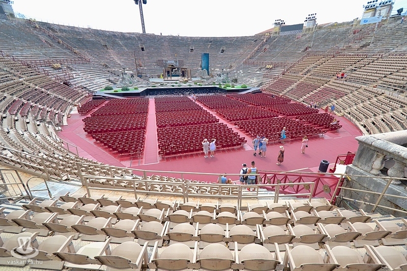 Az Aréna a város leghíresebb látványossága: a harmadik legnagyobb amfiteátrum a világon. Az egykori gladiátorok küzdőtere később színházzá alakult, s mára a veronai operafesztivál színhelye is. 1913-ban az Aida bemutatójával kezdődött meg az előadások sora. A nézők közt ott volt Puccini, Mascagni - nekik nyilván alap volt- de ott volt Maxim Gorkij és Franz Kafka is! Az Aréna eredetileg 30 ezer nézőt tud befogadni, de mára a biztonsági előírások a 15 ezer nézőt maximálják. Csak a véletlen, hogy képeink készültekor a díszletmunkások éppen az esti Aida előadásra rendezték a színpadot.