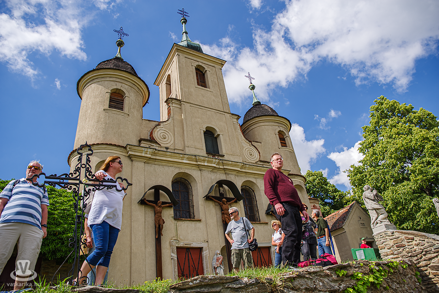Történelmi sétánk innen a Kálvária-hegyre vezetett, csodálatos szőlőskertek mellett. Az enyhe kaptató mentén 14 stációt helyeztek el. A stációk Ludwig Shöne alkotásai. Az 1763-ban állított kőstációkat, amelyek Georg Schweitez munkája, 1890-ben a templomkerítésbe falazták be. Ezt már Győrffy Gábortól, az Írottkő Natúrpark turisztikai menedzserétől, sétánk vezetőjétől tudtuk meg a hegytetőn, a különleges szépségű Kálvária templom előtt.