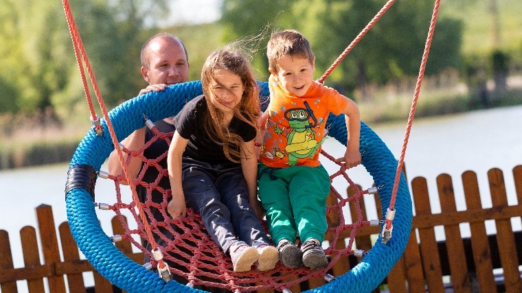 Gyerekeket édesapjuk hintáztat (Fotó: MTI/Varga György)