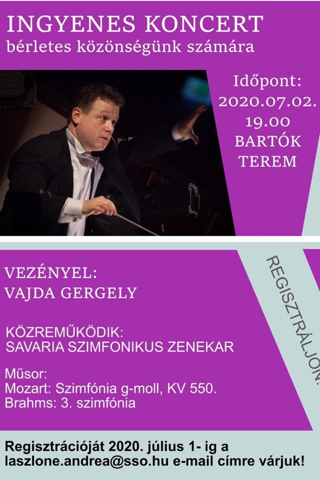 Bérletes közönségét örvendezteti meg ingyenes koncerttel a Savaria Szimfonikus Zenekar a Bartók Teremben, ahol július 2-án Mozart és Brahms egy-egy szimfóniáját tűzi műsorára Vajda Gergely vezényletével. A belépés a bérletes közönség számára ingyenes, de regisztrációhoz kötött! Regisztrálni július 1-ig lehet a plakáton megadott e-mail címen.