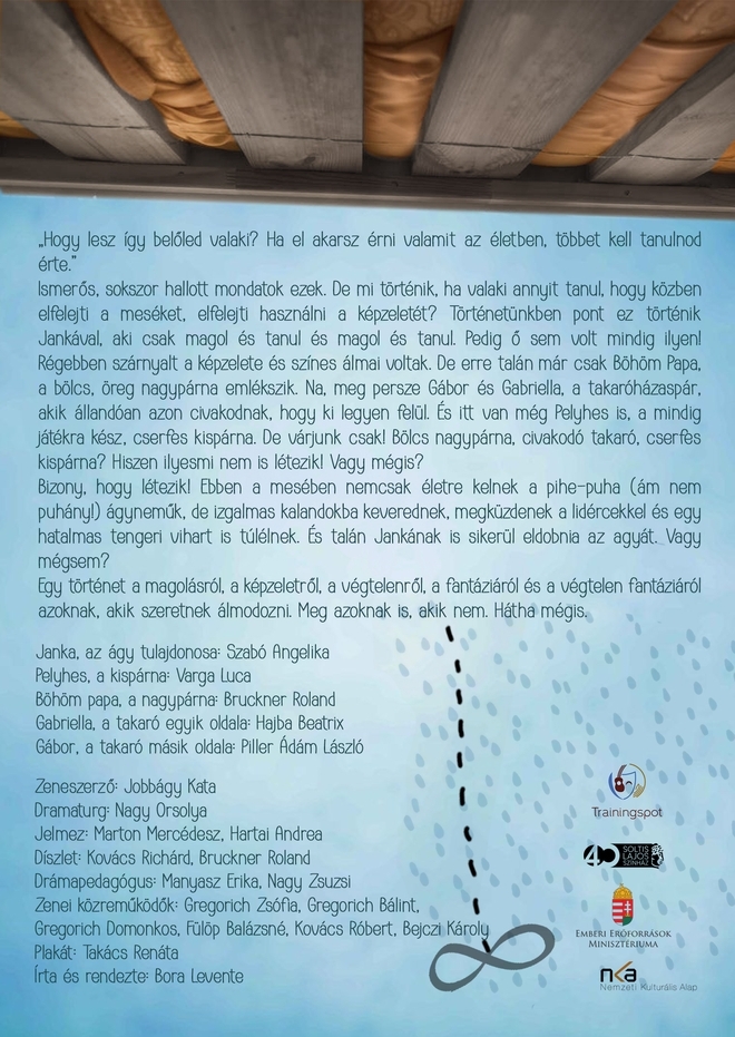 Új, gyermekeknek és családoknak szóló darabot vitt színre a Soltis Lajos Színház és a Trainingspot Társulat. A Bora Levente írta és rendezte mesejáték egy kispárna, egy nagypárna, a takaró két oldala és az ágy gazdája, Janka körül játszódik, és legalább annyira játékosan mosolyogtató, mint amennyire gyermeki komolyságában megható. Az előadás és az azt kiegészítő színházi nevelési program szeptembertől szerepel a Soltis Lajos Színház repertoárjában.