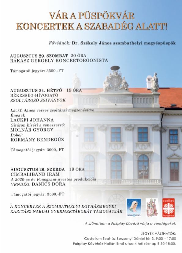 Augusztusban három alkalommal is szabadtéri koncertet rendeznek a szombathelyi Püspöki Palota kertjében. A koncertsorozat keretein belül fellép Rákász Gergely koncertorgonista, valamint a Cimbaliband Danics Dórával, és hallhatóak lesznek Lackfi János megzenésített verses zsoltárai is. A koncertek a Szombathelyi Egyházmegyei Karitász nardai gyerektáborát támogatják.