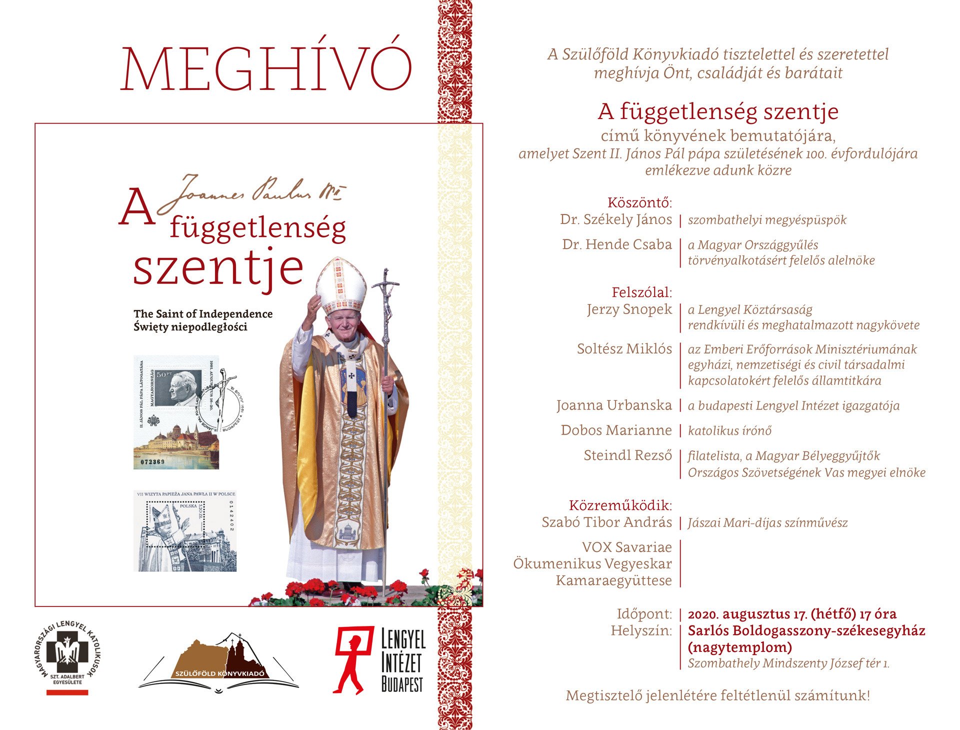 Augusztus 17-én, hétfőn könyvbemutatóra várják az érdeklődőket a szombathelyi Székesegyházba. Idén jelentős évfordulót ünnepel a keresztény katolikus világ: kereken száz éve látta meg a napvilágot Karol Wojtyla, aki később II. János Pál pápaként vonult be a történelmünkbe és máig páratlan tisztelet övez. A megemlékezésből a Szülőföld Könyvkiadó is kivette a részét. A függetlenség szentje címmel készített egy különleges albumot, amely a Szentatyáról kiadott bélyegeken keresztül mutatja be pápaságát, utazásait.