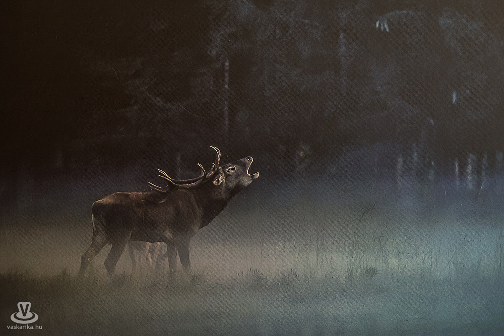„Volt egy a vége felé, ami nagyon intenzíven él bennem. Szélsőséges, furcsa időjárás jellemezte az augusztus vége - szeptember eleje közti időszakot. A vad becserkészésének egyik legfontosabb feltétele a széljárás ismerete, mivel nagyon éber állatok, nagyon érzik a szagot és elriadnak. Volt egy álmom, egy vízióm, hogy ködben bőgő szarvasbikát fotózok, amit a Rába partra álmodtam meg, mert az áll hozzám a legközelebb. Egyik alkalommal este 6 óra tájékán megjelent egy szarvasbika, és a lessel szemben volt egy kicsi nyiladék. Az volt az elképzelésem, hogy mennyire ideális lenne, ha abban a nyiladékban bőgne nekem, és rá fél óra múlva az a szarvasbika megállt a nyiladékban, ott egyet bőgött és továbbment. Valószínű szagot kapott és elugrott. Na, gondoltam, akkor itt vége is a mutatványnak. Egy óra múlva már-már kezdett sötétedni, és megjelent a Szala partjára jellemző köd, ami úgy egy méter magasan van, és megül, mint egy fehér szőnyeg. És kijött vissza? Az a bika, akit egy jó órával ezelőtt fotóztam. Ami ezután történt, olyan volt, mintha egy modellfotózás lett volna - csak éppen instruálni nem tudtam, ezt megtette helyettem magától a bika. Lefotóztam a nyiladékban fényes nappal, így készült egy őszi színhatású kép róla, majd kijött ugyanez a bika este, szembefordult velem, bőgött, balra fordult bőgött, jobbra fordult bőgött, bement a ködbe, ahol ugyanezt megcsinálta, majd kijött a ködből. Ez a "pózolás" minden természetfotós álma. Amit én elképzeltem x évvel ezelőtt, hogy hogyan fogom majd fotózni a szarvasbőgést, azt ő produkálta nekem 10 perc alatt! Hihetetlen élmény és egyben megható volt, hogy az álmom hogyan tudott megvalósulni ott helyben, ilyen rövid idő alatt. Ebből a 10 percből 3 kép szerepel a 20 képes tárlatanyagban."