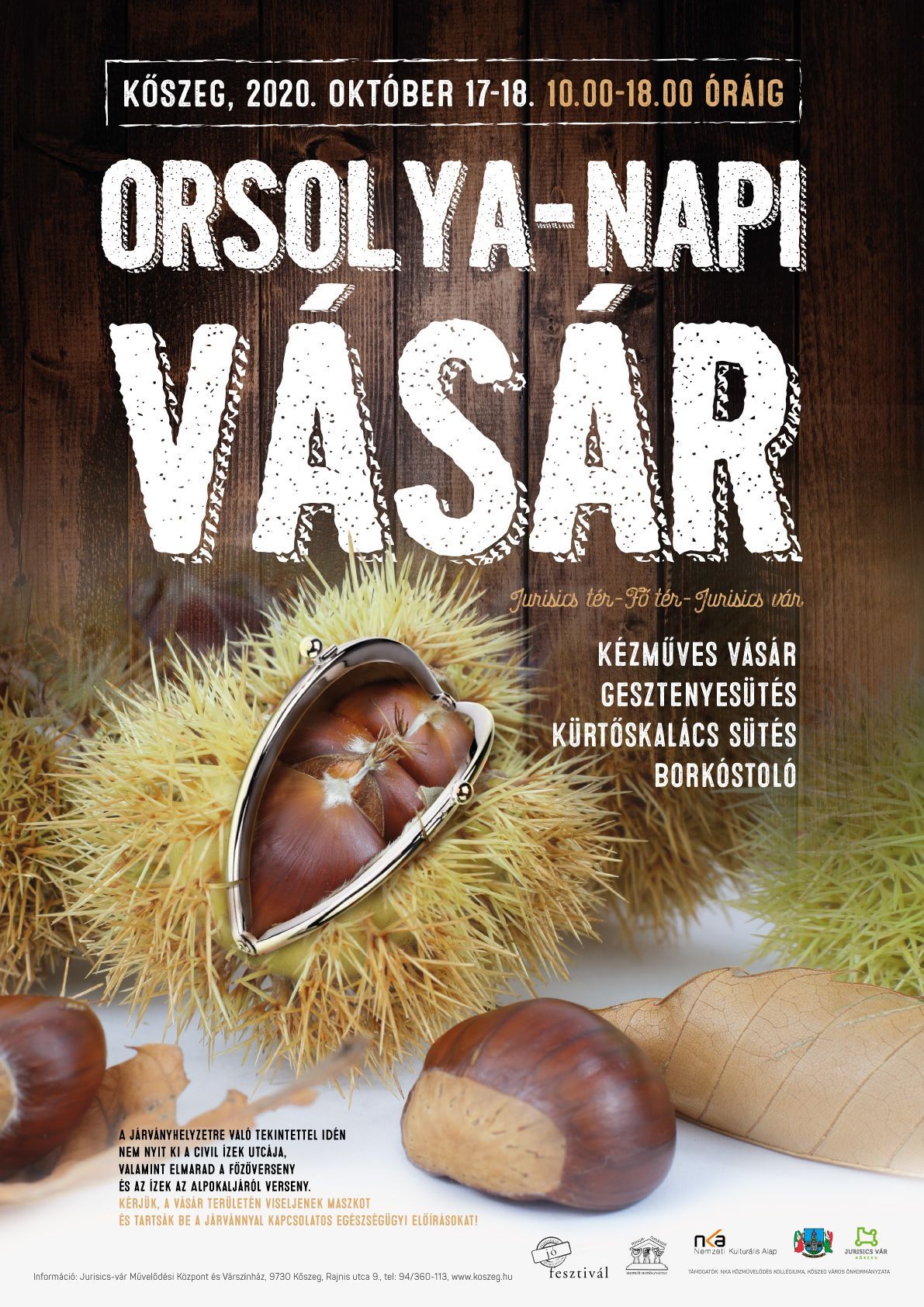 Az idén 19. alkalommal rendezi meg Kőszegen az Orsolya napi vásárt a Jurisics-vár Művelődési Központ és Várszínház. A járványveszélyre való tekintettel nem szervezik meg a Civil Ízek Utcájában a főzőversenyt és nem lesz Az Alpokalja ízei vetélkedés sem. A helyi kézművesek a Jurisics-vár külső udvarán, míg a vendég vásározók a Jurisics téren és a Fő téren árulják portékáikat, ahogy azt tették elődeik is sok száz évvel ezelőtt.