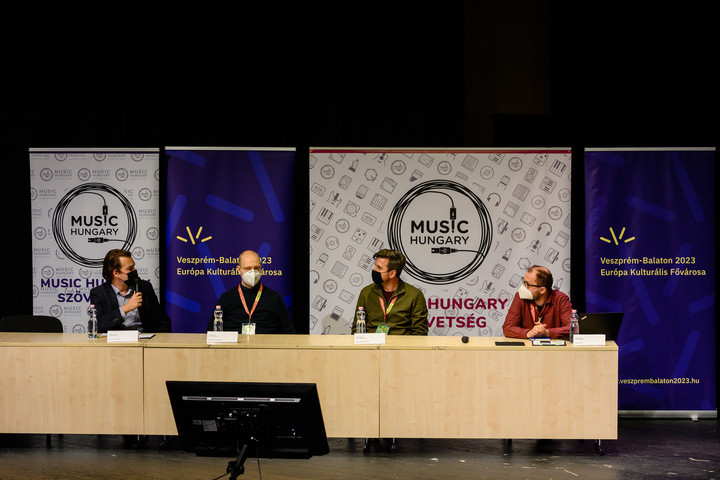Stumpf András újságíró, moderátor, Tóth Péter Benjamin, az Artisjus üzleti transzformációs igazgatója, Pécsi-Szabó Dénes zenei menedzser, az UP Music Management Budapest alapítója és Főző Zsolt, a Hétfa Kutatóintézet vezető elemzője (b-j) a VIII. Music Hungary Konferencia kerekasztal-beszélgetésén a veszprémi Hangvilla kulturális központban 2020. november 9-én