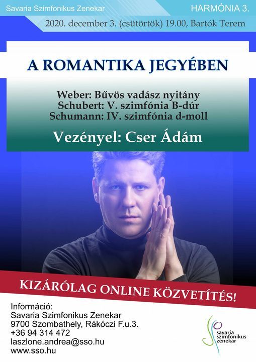 Weber, Schumann és Schubert egy-egy művét hallhatják az online közvetítésre jegyet váltók és a Harmónia bérlet tulajdonosai csütörtökön, 19 órától. A zenekart Cser Ádám vezényli, jegyek az online koncertre a www.sso.hu oldalon vásárolhatók 1500Ft-os áron!