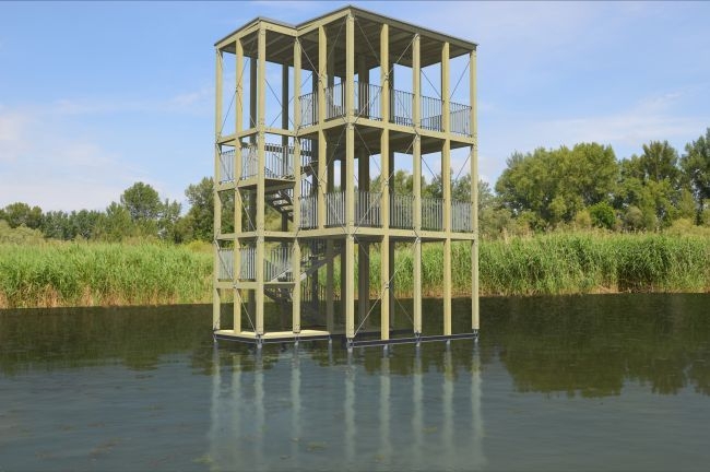 | Az újlőrincfalvi kilátó különlegessége, hogy a vízi járművekkel közvetlenül az építmény alatt lehet majd kikötni - Fotó: Békatutaj Egyesület |