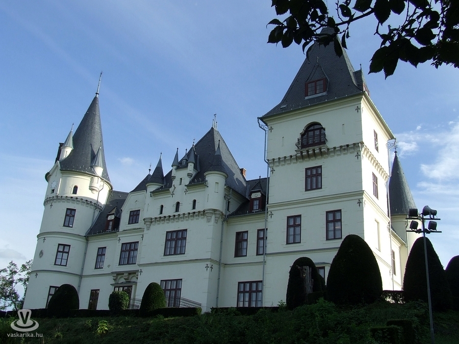 Már hosszabb utat tettünk meg aznapi utolsó, tiszántúli látnivalójának eléréséig. A tiszadobi neogótikus-romantikus Andrássy-kastély már messziről vonzza a tekintetet: a soktornyos palotaépület hatalmas méretű. Andrássy Gyula, a Monarchia első külügyminisztere 1880-85 között építette a pletykák szerint a Loire-menti középkori, lovagi várkastélyok mintájára. Mivel elmúlt már 16 óra, amire odaértünk, pechünkre a kastély bezárt. Érthetetlen ez a korai záróra, de beletörődtünk, és az angolparkban egy sétával kárpótoltuk magunkat. Többedmagunkkal - többek között fényképezkedő esküvői párral - jártuk be a hatalmas, a most is szépen rendben tartott óriáskertet, melyben karikára nyírt bukszusbokrok, gúlára formázott tuják között romantikus kőszobrok sokasága tárult elénk.