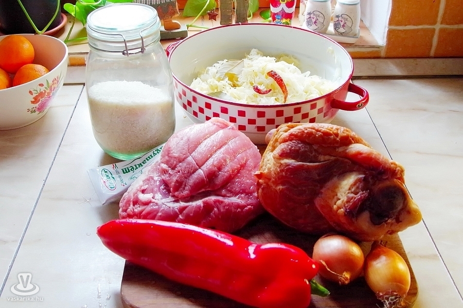 Miután a húst ilyeténképpen beszereztem, és kaptam igencsak finom véres hurkát is mellé, elindultam a káposzta lelőhelyéhez. A savanyú káposzta házilag is könnyen elkészíthető, jómagam is készítettem már, de most a könnyebb végét fogtam meg a dolognak, és másvalaki hordójából szereztem be. Szóval, némi terefere után indulhattam is haza a sok finomsággal, hogy egy jóféle ételben egyesítsem őket.