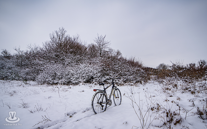 Szűzhóban hagytuk a lábnyomunkat a befagyott Váti-tónál. Sehol senki, amikor egyszer csak feltűnik egy bringa...
