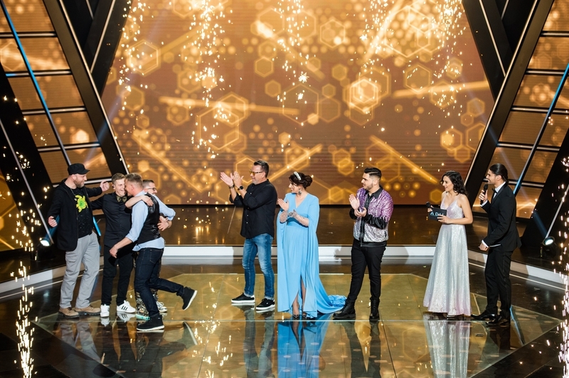 A győztes Kaukázus együttes tagjai (b1-4) A Dal 2021 televíziós show-műsor eredményhirdetésén, mellettük Süle Zsolt (j5), Radics Gigi (j4) és BariLaci (j3) versenyzők, valamint Orsovai Reni (j2) és Fehérvári Gábor Alfréd, Freddie (j) műsorvezetők a Médiaszolgáltatás-támogató és Vagyonkezelő Alap (MTVA) óbudai stúdiójában 2021. március 13-án. MTI/Cseke Csilla