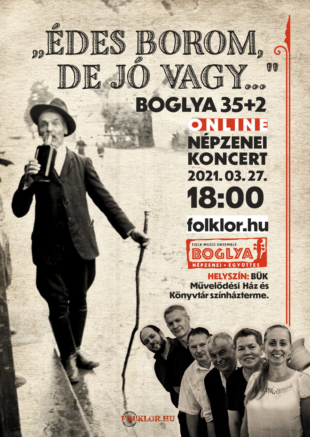 Javarészt erdélyi dallamok képezik a Boglya Népzene Együttes online koncertjének repertoárját, amit a Büki Művelődési Központban vettek fel, és március 27-én, szombaton 18 órától lesz megtekinthető a folklor.hu weboldalon. A műsorban néhány dal elhangzik a nemrég napvilágot látott 'Talpalávaló vasi népzene és dallamgyűjtemény 2.' kiadvány CD-mellékletén megjelent gyűjtésből is.