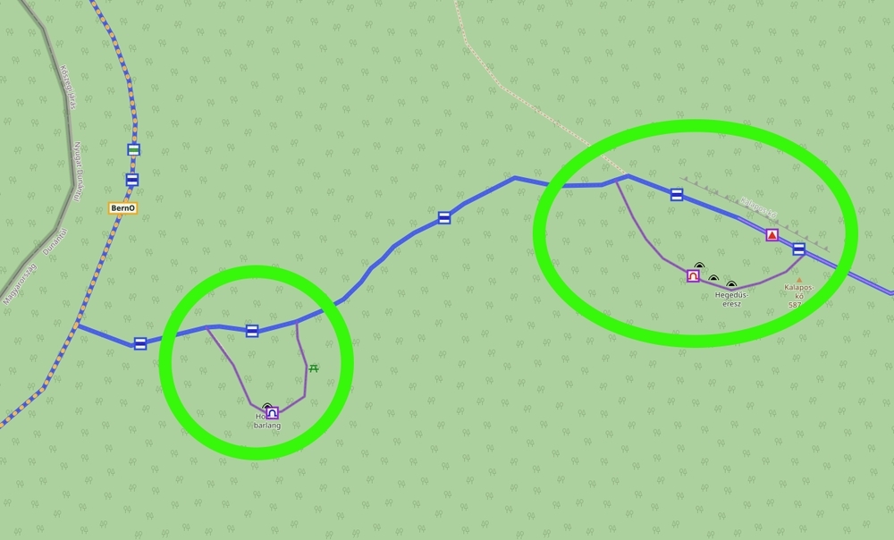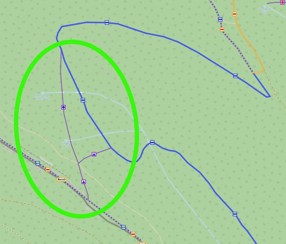 A kék kör, illetve kék háromszög jelzéseknél tettünk egy kis kitérőt. Ezek igen rövid szakaszok, és elvileg nem a feladat részei lettek volna, de bevállaltuk ezeket is, remélve, hogy ide is ki/fel tudjuk csábítani a túrázókat. Hová is? Két foglalatlan forrás, az Ebenspanger János- és Tündér-forrás található a kék kör mentén, míg a kék háromszög a Gyilkos-sziklához vezet fel.