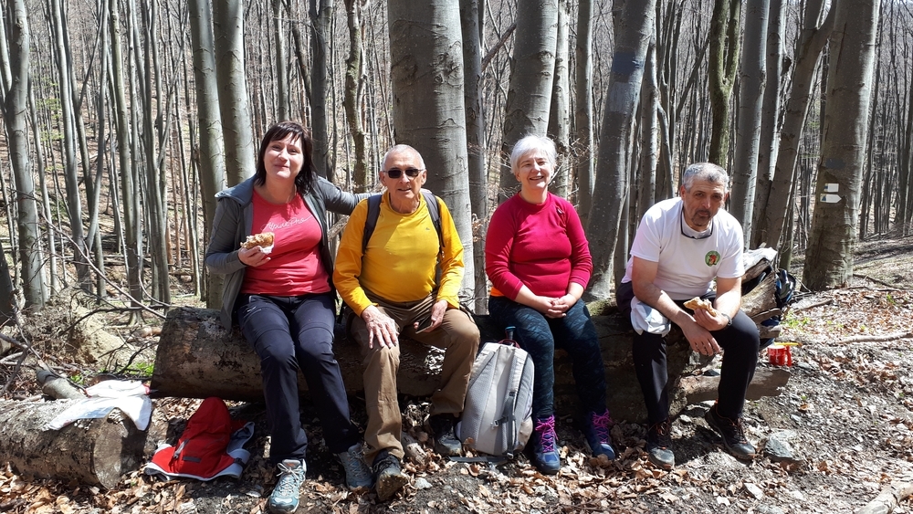 Akárcsak fent a Gyilkos-sziklánál, a Kalapos-kövek után is kihelyeztünk aluoszlopokon irányjelző táblákat (itt már a piros háromszög is csatlakozott). Összesen öt ilyen került ki az említett szakaszra. Ezek festhető fa vagy tereptárgy hiánya miatt váltak szükségessé. Az Óriások lépcsőjén leereszkedve Bozsokra fáradtan, de örömmel zártuk a napot. Jó érzés hasznos, tartós és látványos munkát végezni a természetben - pompás tavaszi időben, patakcsobogás, madárdal és virágillat társaságában. A remek társaság és a derűs jókedv már csak ráadás volt!