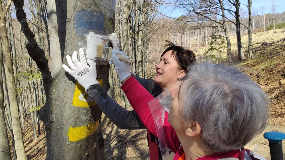 Jelzésfestés a Kéken a Kőszegi-hegységben - Turistajelzéseket festett a Vasi Vándorok Sportegyesület