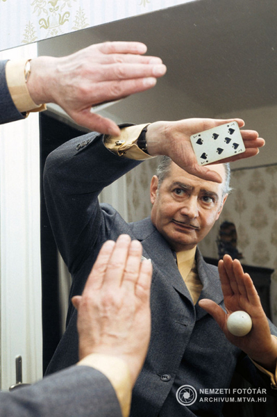 Rodolfo bűvész a tükör előtt gyakorol otthonában 1976-ban (Fotó: Nemzeti Fotótár/Lajos György)
