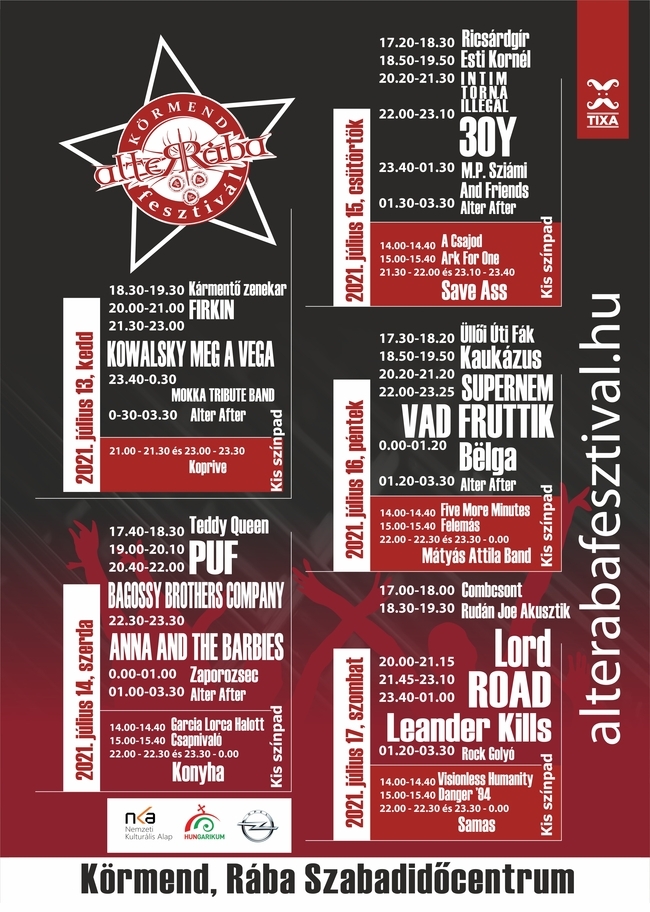 Július 13-17. között ismét Alterába Fesztivál, ami ezúttal létszámkorlát nélkül, ám kizárólag védettségi igazolvánnyal lesz látogatható a körmendi Rába Szabadidőcentrumban. A fesztivál előtti hét sem telik eseménytelenül, 8-án a Tátrai Band, 9-én a P.Mobil várja a rockzene híveit a Rába partra.