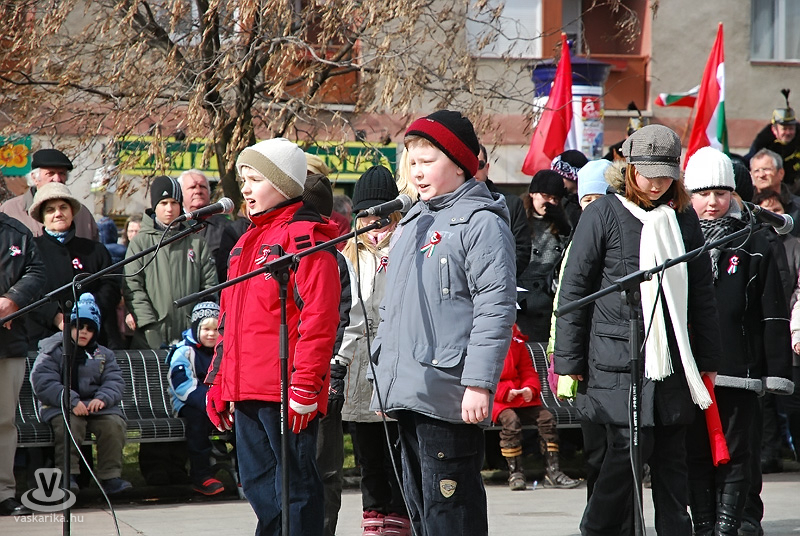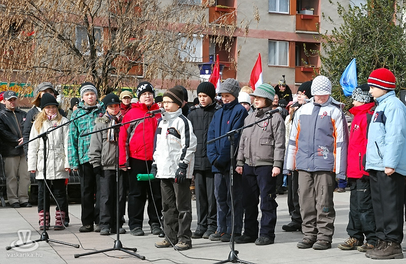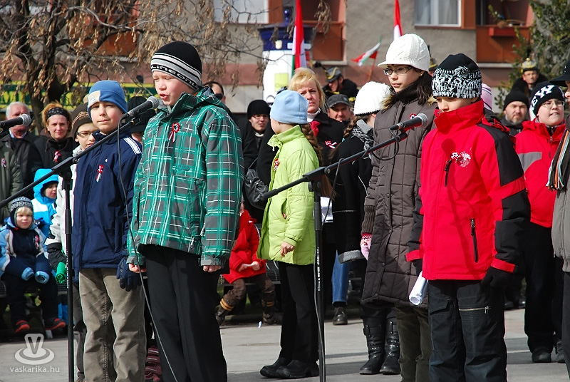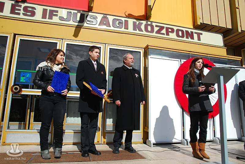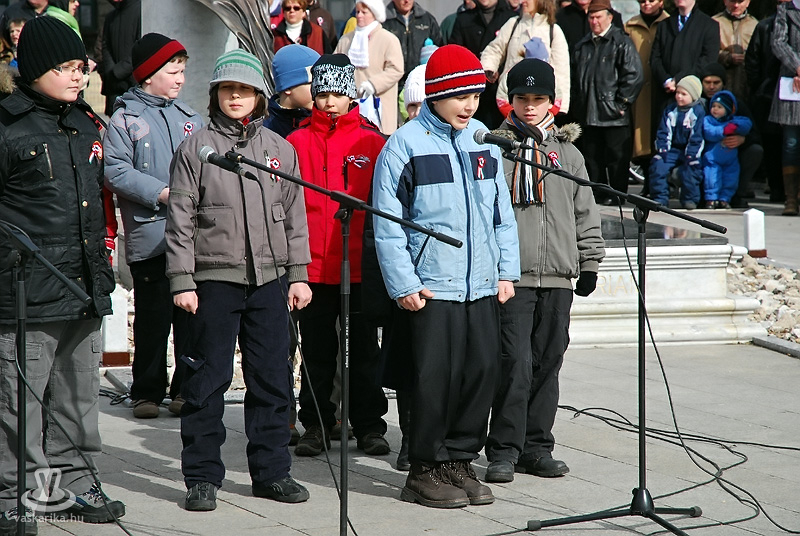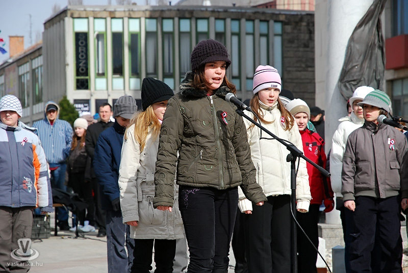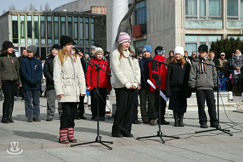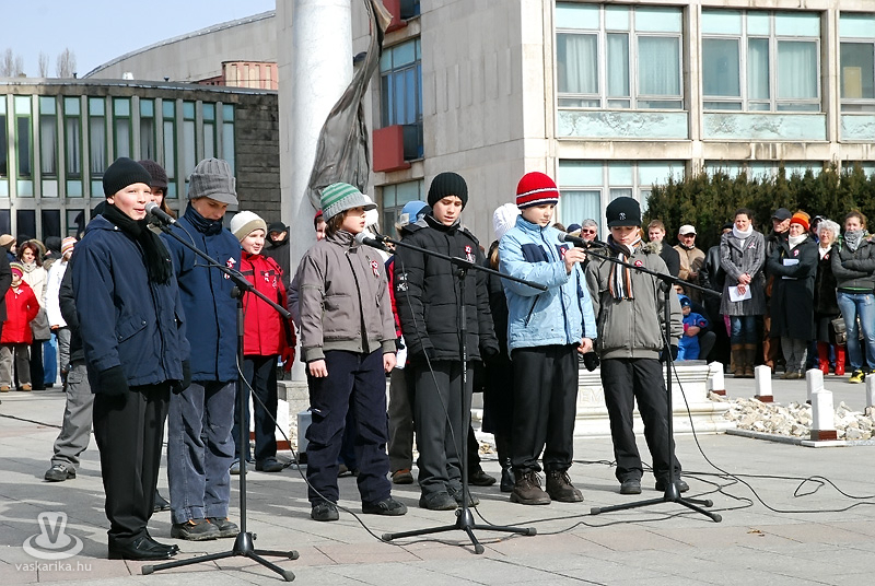 Az ünnepség első helyszínén, a Savaria Múzeum parkjában álló Horváth Boldizsár-szobornál a Polgármesteri Hivatal Versmondó Stúdiójának ünnepi műsora vette kezdetét. Horváth Boldizsár volt a 48'-as pesti országgyűlésen a szombathelyi választókerület képviselője, később Deák Ferenc - a haza bölcse - javaslatára a Kiegyezés első igazságminisztere, 1871-ig. 1848-ban megfogalmazta a város 16 pontját, amely a népképviseleti rendszer követeléseinek nagyszerű helyi dokumentuma volt. Kiáltványa korát meghazudtoló pontokból állt, melyből néhány címszót ragadunk ki: sajtószabadság, népnevelés, büntető törvénykönyv és a jogegyenlőség követelése. Horváth Boldizsár személye, és e nap emléke nem halványulhat el az utókor tudatában és szívében sem.