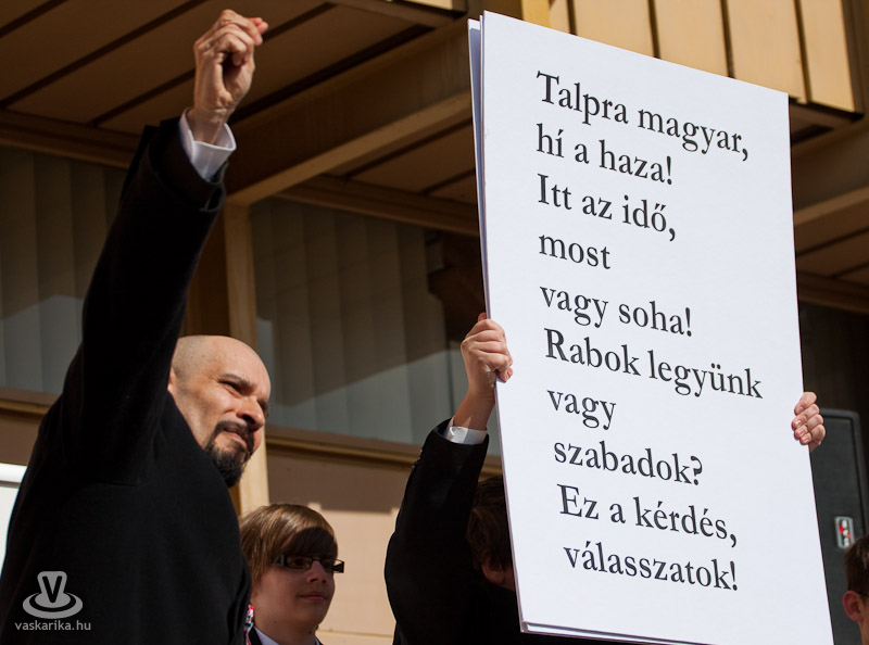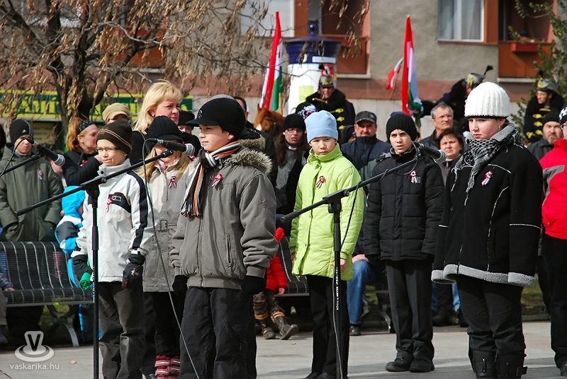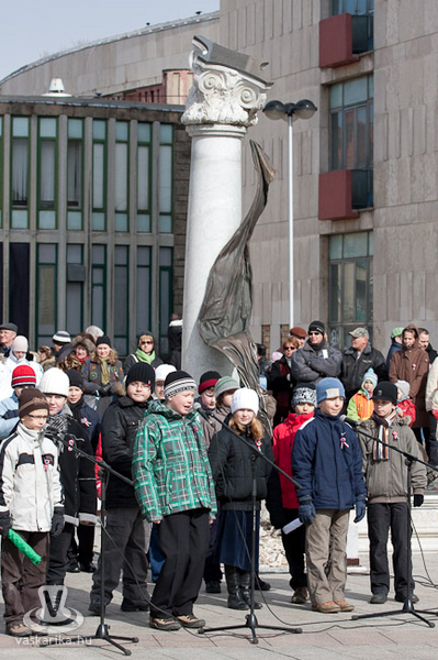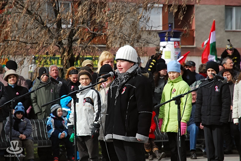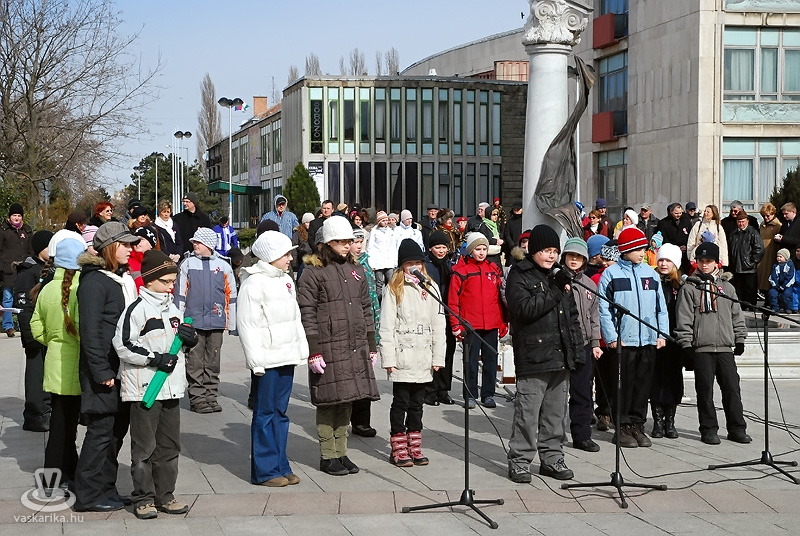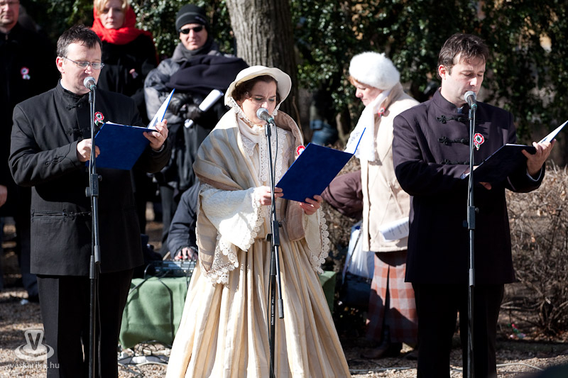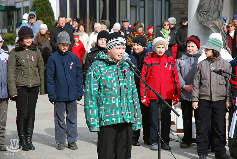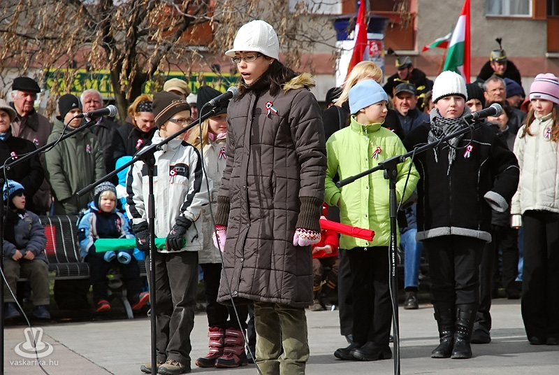 Az ünnepség első helyszínén, a Savaria Múzeum parkjában álló Horváth Boldizsár-szobornál a Polgármesteri Hivatal Versmondó Stúdiójának ünnepi műsora vette kezdetét. Horváth Boldizsár volt a 48'-as pesti országgyűlésen a szombathelyi választókerület képviselője, később Deák Ferenc - a haza bölcse - javaslatára a Kiegyezés első igazságminisztere, 1871-ig. 1848-ban megfogalmazta a város 16 pontját, amely a népképviseleti rendszer követeléseinek nagyszerű helyi dokumentuma volt. Kiáltványa korát meghazudtoló pontokból állt, melyből néhány címszót ragadunk ki: sajtószabadság, népnevelés, büntető törvénykönyv és a jogegyenlőség követelése. Horváth Boldizsár személye, és e nap emléke nem halványulhat el az utókor tudatában és szívében sem.