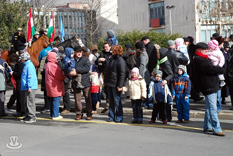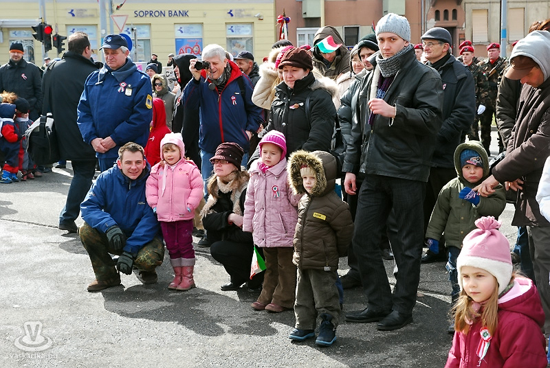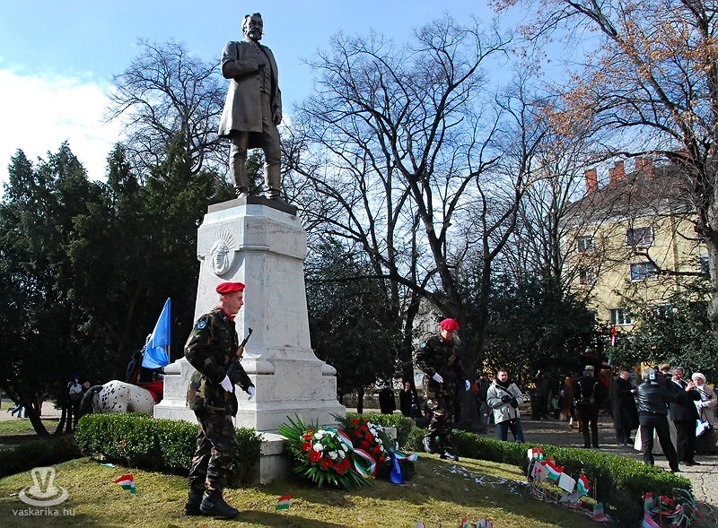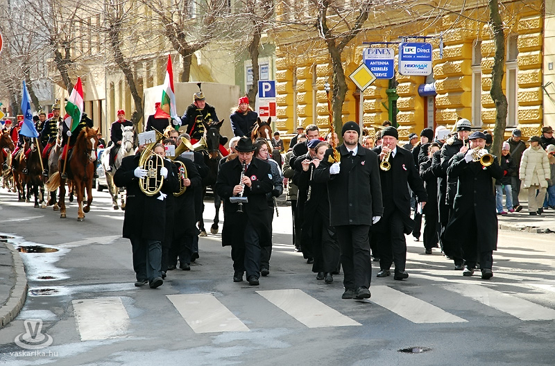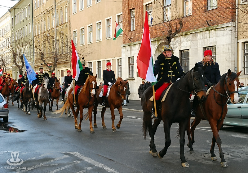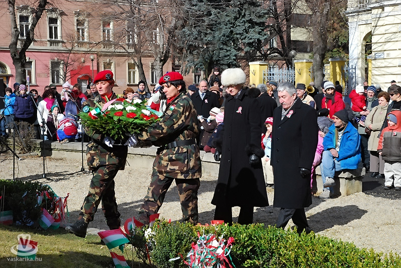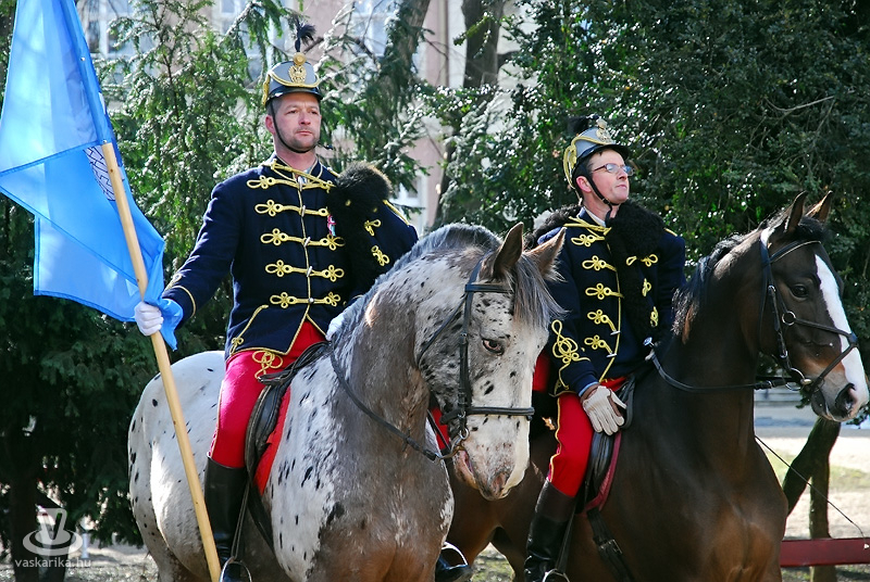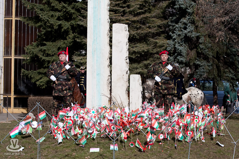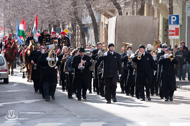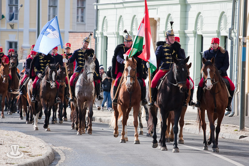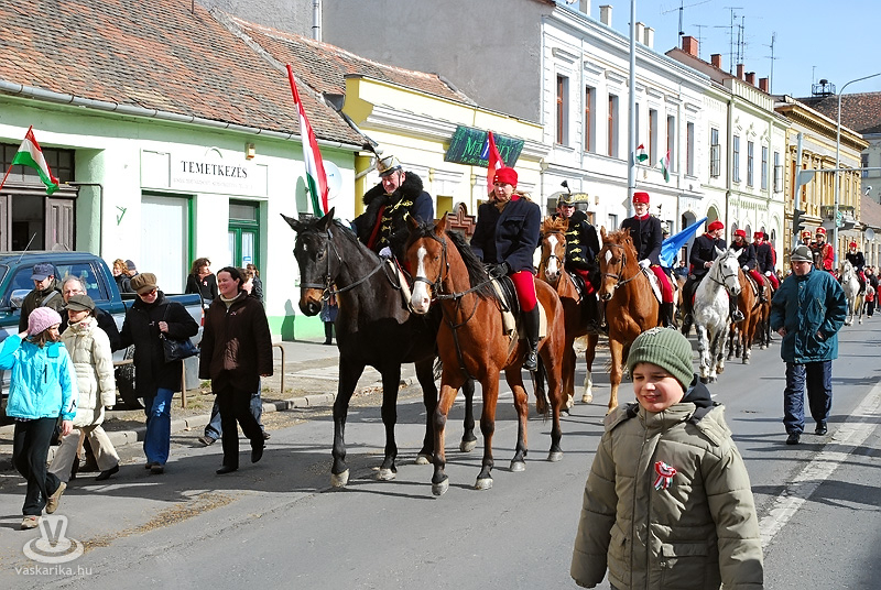 Borús reggelre ébredt a város, mint ahogy 1848-ban a márciusi ifjak. A reggeli csendet csak a huszárok és lovaik mozgolódása zavarta meg. A huszárok felvonulása minden évben az Aréna utcából a Petőfi Sándor-szoborig tart, melynek első állomása a Fő téri Szentháromság-szobor. Itt a Vasi Lovasturisztikai és Hagyományőrző Egyesület tagjai tartottak lovasbemutatót, mindeközben már az időjárás is gondoskodott a megemlékezés megfelelő tiszteletéről.