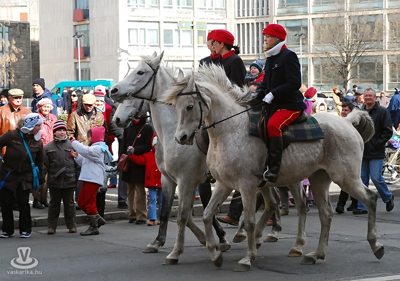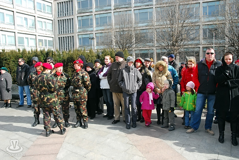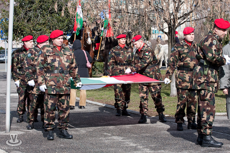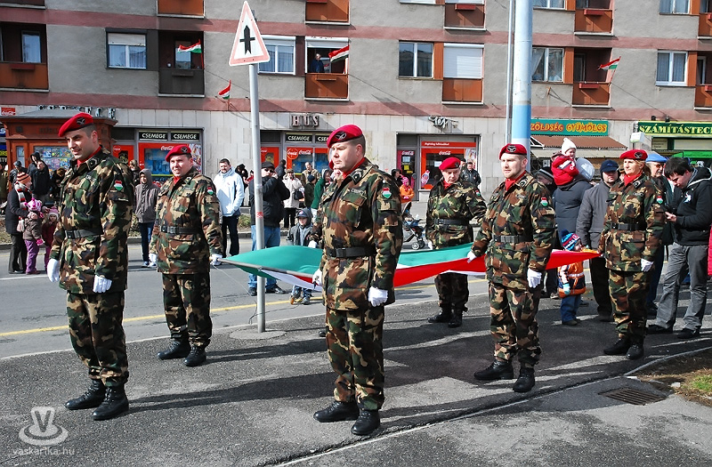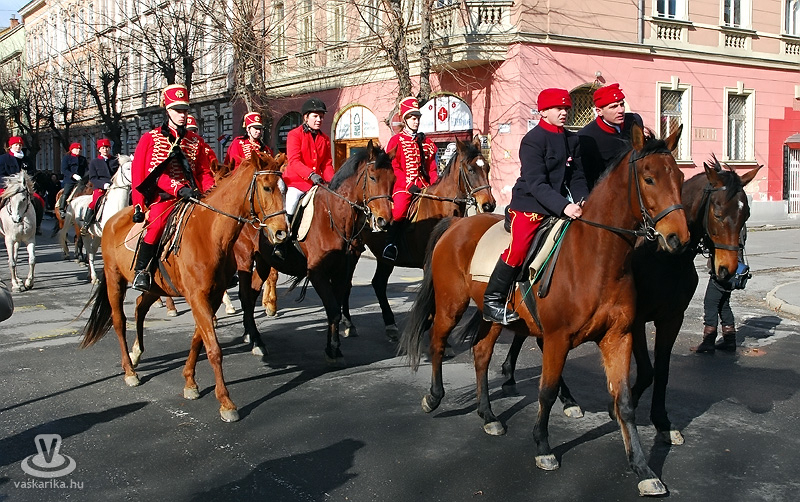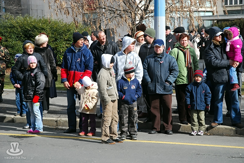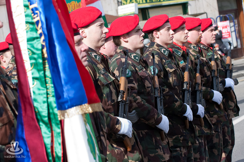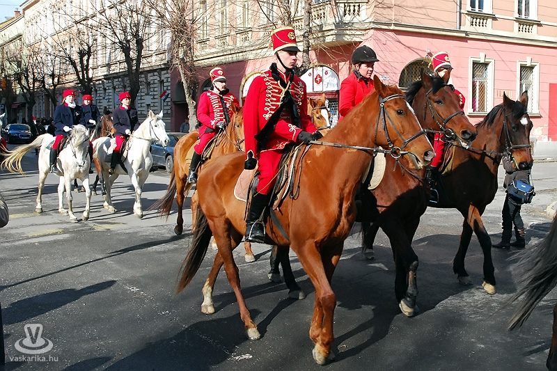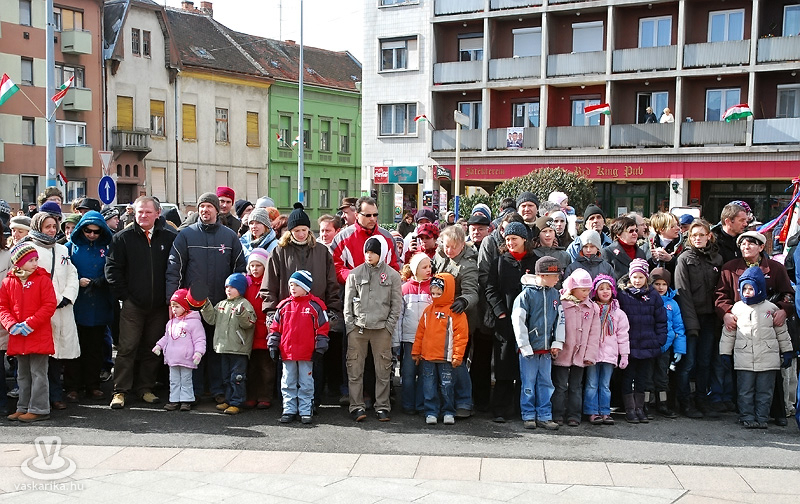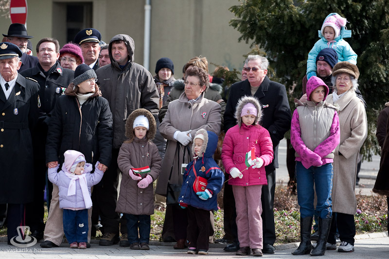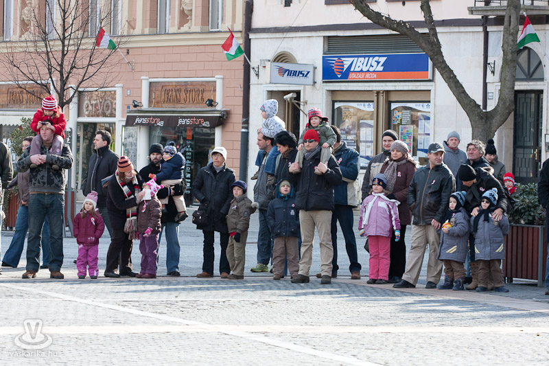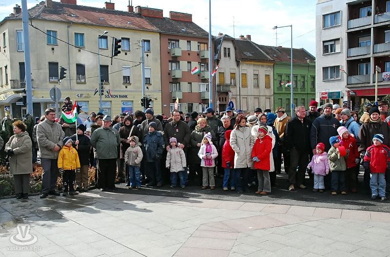 Borús reggelre ébredt a város, mint ahogy 1848-ban a márciusi ifjak. A reggeli csendet csak a huszárok és lovaik mozgolódása zavarta meg. A huszárok felvonulása minden évben az Aréna utcából a Petőfi Sándor-szoborig tart, melynek első állomása a Fő téri Szentháromság-szobor. Itt a Vasi Lovasturisztikai és Hagyományőrző Egyesület tagjai tartottak lovasbemutatót, mindeközben már az időjárás is gondoskodott a megemlékezés megfelelő tiszteletéről.