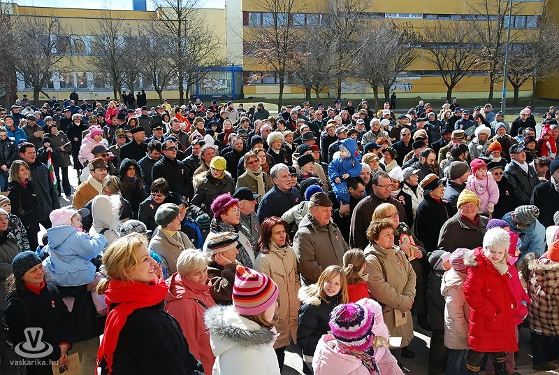 A megemlékezés ezt követően az MMIK előtti Petőfi szobornál folytatódott, ahol több száz ember élvezte az ünnepi programokat. Fűzfa Balázs irodalomtörténész rövid beszéde után Kelemen Zoltán, a Weöres Sándor Színház színésze vette át a szót, és a tavalyi Márczius szellemi atyja emlékezett meg a márciusi ifjakról. Ő helyettesítette Jordán Tamást, aki ezen a napon vette át a Magyar Köztársasági Érdemrendet a Parlamentben. A szombathelyi színház színésze új tördeléses módszert próbált megtanítani az ünneplőkkel. Jó tanárnak bizonyult, mivel rövid gyakorlás után a tömeg egyemberként szavalta a Nemzeti Dalt. Ünnepi beszédet mondott dr. Ipkovich György polgármester is, aki mondandójában kitért az 1848-as eseményekre, és az ünnep kialakulásának előzményeire. Kossuth Lajos fia, Ferenc 1897-ben, a Negyvennyolcas Párt képviselőjeként javasolta a Parlamentben, hogy március 15-ét nyilvánítsák nemzeti ünnepnek. A történelmi áttekintés után a szombathelyi változásokról beszélt a városvezető: „Horváth Boldizsár vezetésével már március 17-én megtartott rendkívüli közgyűlésen megfogalmazta 16 pontját, mely több tekintetben túlmutatott a pesti 12 pontot. ... Elődeink a régi társadalmi rendet fenekestül felforgatták a forradalom közepén és fontosnak tartották az oktatást és a tudást. Felismerték, hogy szabadsággal helyesen élni csak úgy tud az ember, ha széles látókörrel és kiművelt fővel rendelkezik."