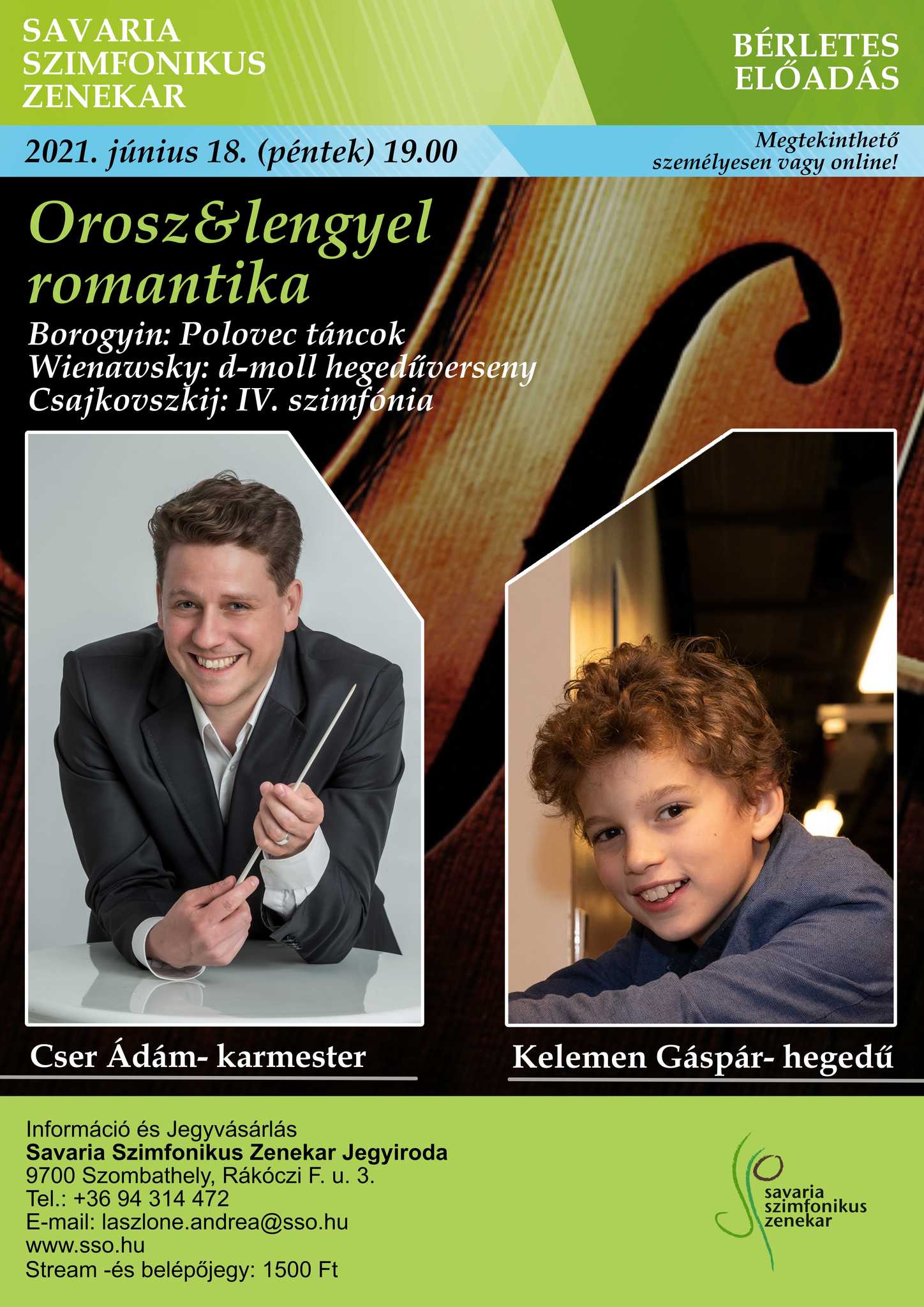 Június 18-án tartja évadzáró hangversenyét orosz és lengyel szerzők műveiből a Savaria Szimfonikus Zenekar, Cser Ádám vezényletével. Közreműködik Kelemen Gáspár hegedűn.