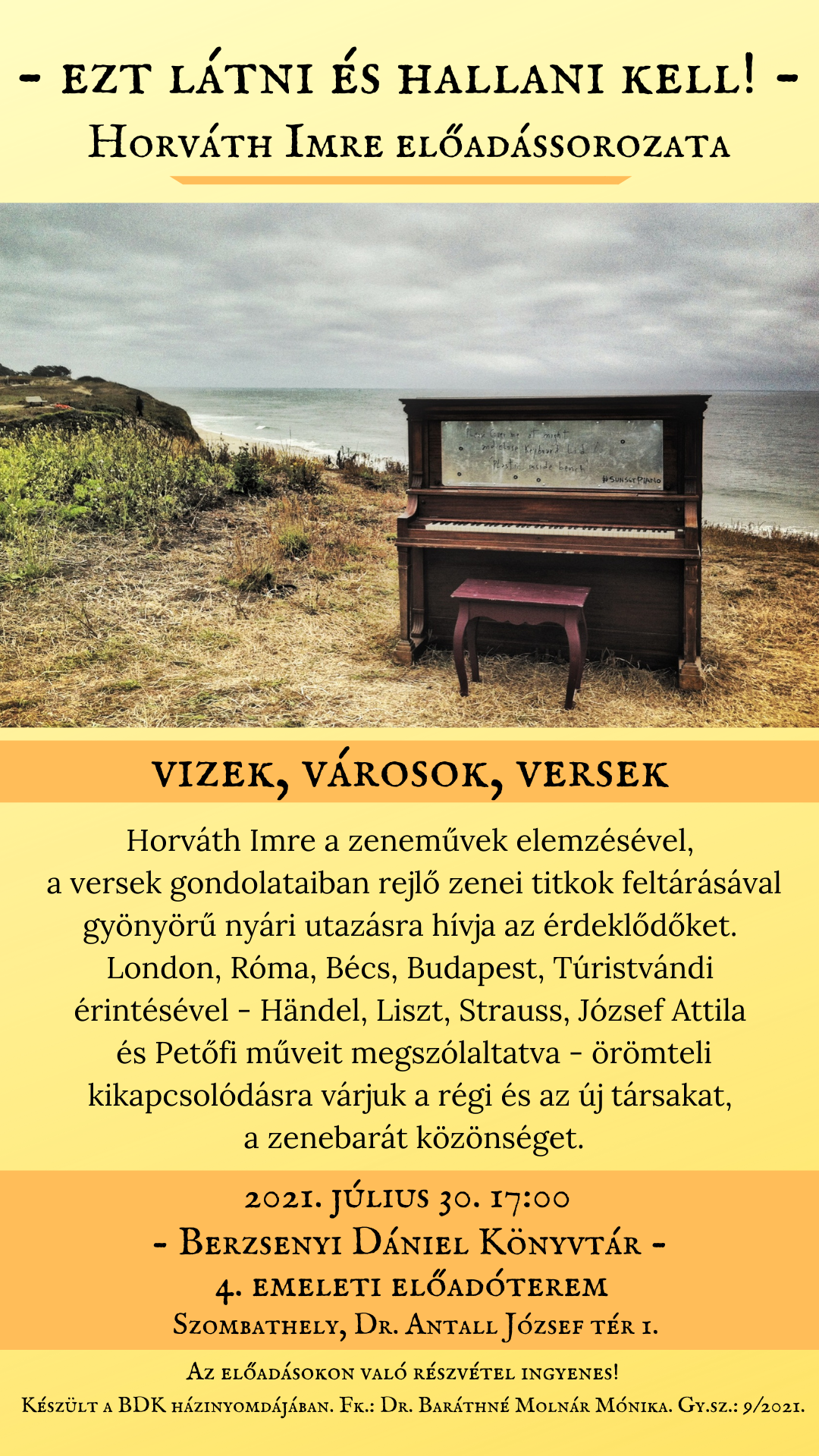 Horváth Imre a zeneművek elemzésével, a versek gondolataiban rejlő zenei titkok feltárásával gyönyörű nyári utazásra hívja az érdeklődőket. London, Róma, Bécs, Budapest, Túristvándi érintésével - Händel, Liszt, Strauss, József Attila és Petőfi műveit megszólaltatva - örömteli kikapcsolódásra várjuk a régi és az új társakat, a zenebarát közönséget.