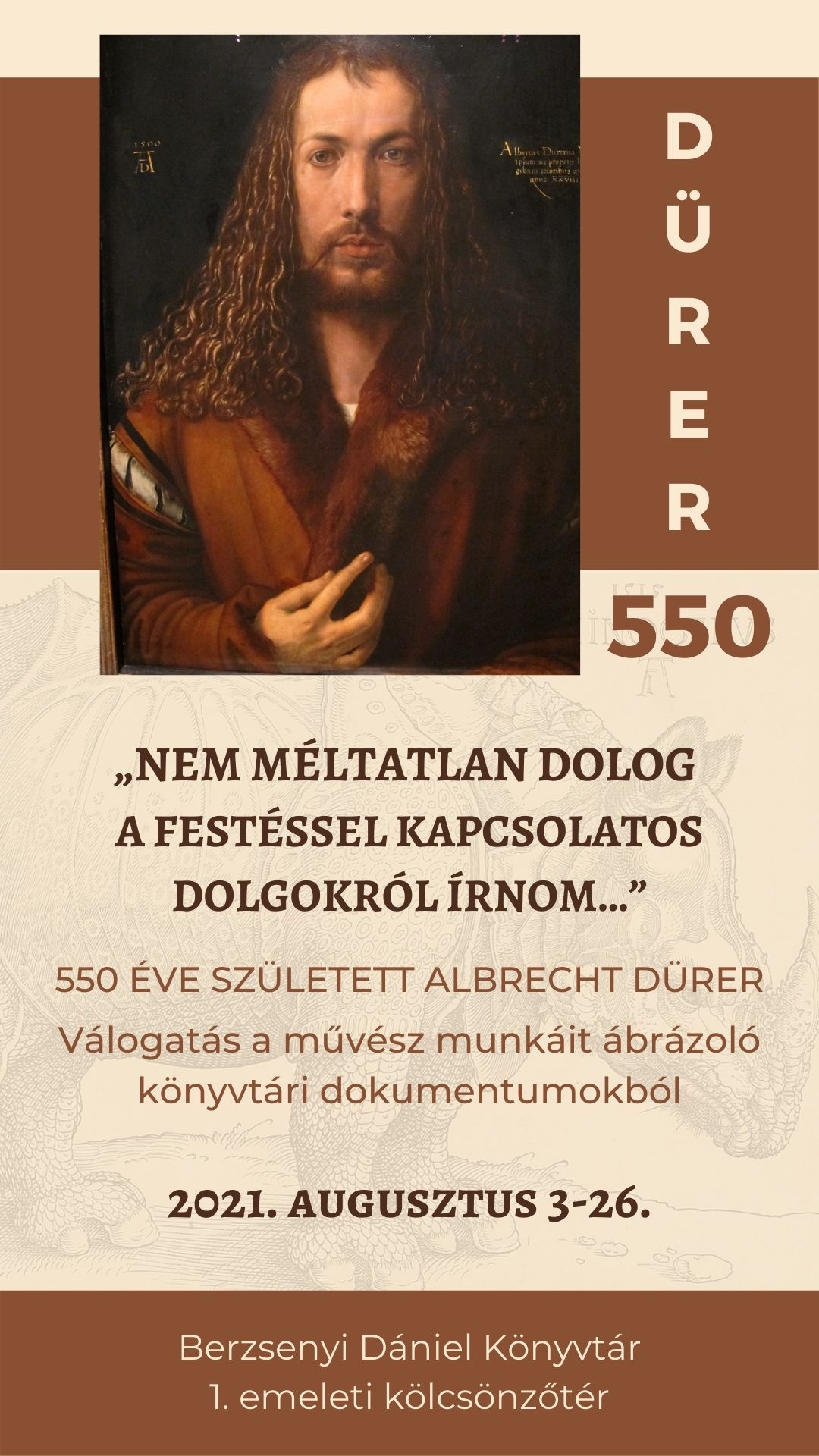 Dürer életének néhány fontosabb részlete mellett a festészettel, művészettel, emberábrázolással kapcsolatos gondolataiból, munkáiból is válogattak a kiállítás megálmodói. Érdekességként bekerült egy ismertető is Guilielmus Durano Rationale Divinorum Officiorum című kötetéről. Az 1494 szeptemberében nyomtatott kötetekből öt példány található magyarországi közgyűjteményekben, s ezek közül csak három maradt fenn teljes egészében, köztük a Berzsenyi Dániel Könyvtárban őrzött ősnyomtatvány. A kötetnek Dürer munkásságával úgy van kapcsolata, hogy Anton Koberger nürnbergi ősnyomdász híres műhelyében készült, aki keresztapja volt Dürernek. A grafikus, festőművész számos könyvillusztrációt is készített, melyekről gyakran hiányzik a monogramja. A Koberger-könyvekben feltételezhetően Albrecht Dürer fametszetes illusztrációi szerepelnek.