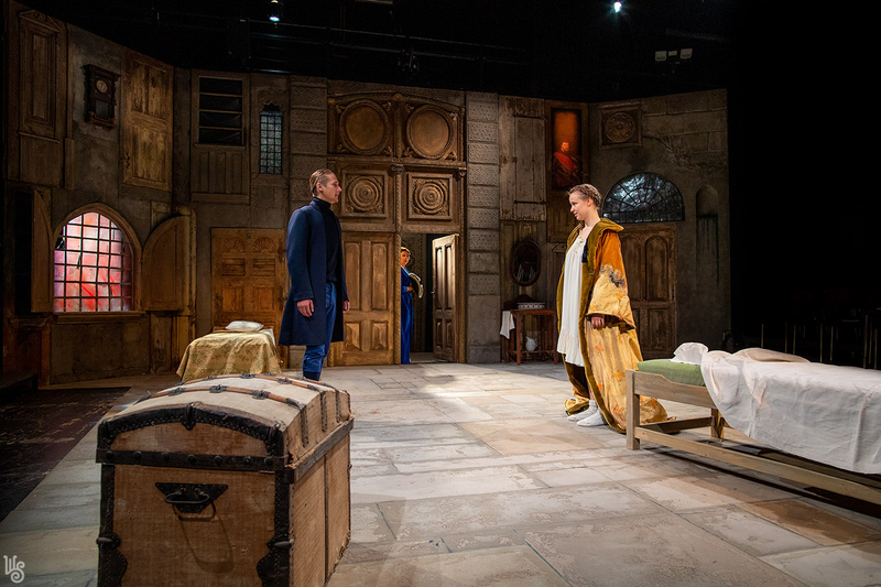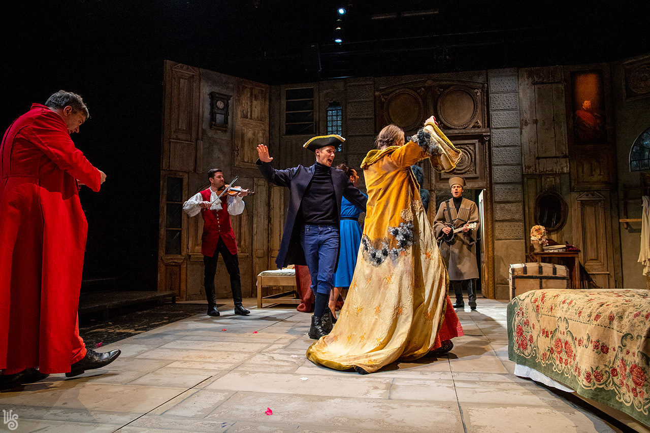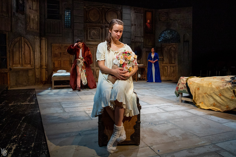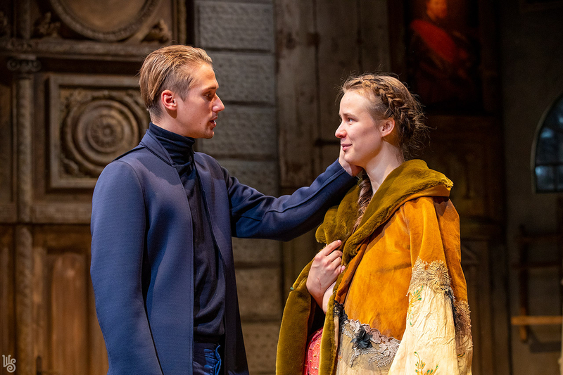 A Márkus Emília terembe lépve rokokó látvány tárul elénk a színpadon, a díszes ajtó, az ágyak, a ruhásláda, a színes ablaküveg sejtetik, hogy a jelenből kiröppenve történelmi korba kerültünk. A mobil nézőtér három oldalról veszi körbe a színtért, szinte belekerülünk a darabba. Egy határmenti fogadó jelenik meg előttünk, ahol a 19 éves Alarcia királykisasszony (Mari Dorottya e.h) élete nagy eseménye előtt áll, hamarosan Occident királyának felesége lesz. Lázasan készül az esküvőre, nem tud aludni, folyton csak az előtte álló új életére gondol. Szíve tele van őszinte lelkesedéssel, a nevelőnőjét (Bálint Éva) sem hagyja nyugton, aki csendes beletörődéssel veszi tudomásul, hogy az alvásnak már lőttek. Kint tombol a tél, időnként halljuk, ahogy süvít a jeges a szél, ám Alarcia szíve egyáltalán nem fagyos, legalábbis a színmű elején, amikor még abban a boldog tudatban ringatja magát, hogy egy gazdag birodalom uralkodójának a felesége lesz. Nem könnyű a gyerekkortól való elválás, búcsút inteni a szegényes, nyírfaligetekkel teli, ám mégis annyira szeretett szülőföldnek, de Alarcia felkészült rá, hogy új hazájába lépjen. Számolja a bárányokat az ágyában, hogy mégis el tudjon aludni, de a bárányok valahogy bajszos katonatisztekké alakulnak át a képzeletében.