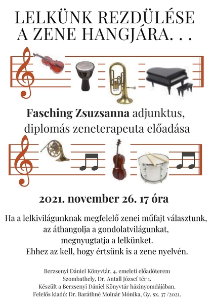 A Berzsenyi Dániel Könyvtárban november 26-án 17 órakor Fasching Zsuzsanna adjunktus, diplomás zeneterapeuta (ELTE SEK Zenepedagógiai Tanszék) tart előadást Lelkünk rezdülése a zene hangjára… címmel.