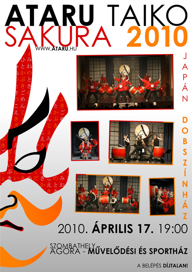 A folyamatosan változó színpadkép is ezt erősíti, mintha más és más helyszíneken kalandozna a társulat és néző egyaránt. A látvány pedig önmagáért beszél... a díszlet, a fellépők ruházata és a részletesen kidolgozott koreográfia lebilincselő élményt nyújt. Ebbõl a sokszínűségből születik meg az a lelki feltöltődés, melyről időről-időre beszámolnak az ATARU TAIKO ütőegyüttes koncertjeinek látogatói. Legyen Ön is részese 2010. április 17-én 19 órától a szombathelyi AGORA - Művelődési és Sportházban megrendezésre kerülő SAKURA 2010 előadásnak és hallgassa élőben Közép-Európa legnagyobb taiko dobját.