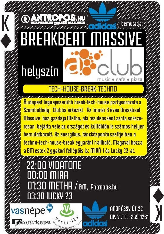 A breakbeat sem vész el, csak átalakul. A nagy zenei egybeolvadás nem hagyta érintetlenül a legütősebb középtempót sem. Beszivárogtak az elektro, a house, a tech és szinte minden vonal okosságai, de amíg az élő pergő dominál és a mézesbödön subok rezgetik a ház oldalát, addig nagy gond nem lehet. A fővárosi partiélet prominens brékügyi promotáló szerveződése, a BM látogat ezúttal az egyetemi klubba, a fővezér Metha, Mira és Lucky23 pakolja aktuális kedvenceit, warm up-ol Vidaotone.