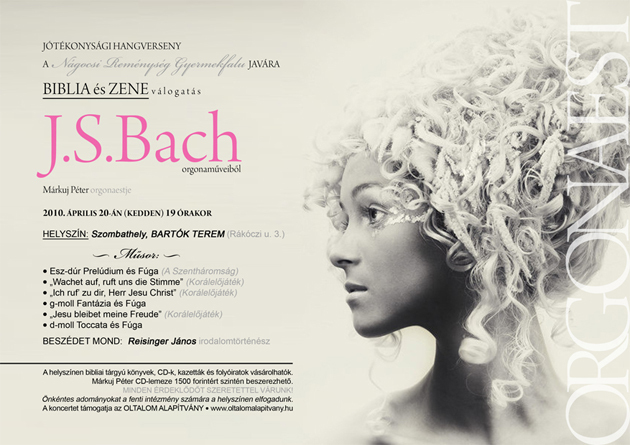 Biblia és zene címmel jótékonysági orgonaest lesz a Bartók teremben a nágocsi Reménység Gyermekfalu számára. J.S. Bach műveit Márkuj Péter orgonaművész játssza, beszédet mond dr. Reisinger János irodalomtörténész.