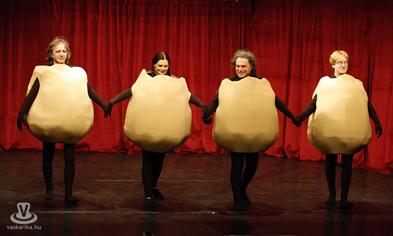 Került még a levesbe egy kis Csókkirályosdi, ami feltöltött szájjal az igazi, meg egy parasztrocker faszagyerek (a Bunkó), fukszos, izmos, kendős mutatványa. Arról nem is beszélve, hogy amikor a gyermekvállalásra terelődött a szó, a gyermek ijedten jegyezte meg, hogy ő biz' nem akar a vállával ásni. Az egybegyűltek kaptak némi irodalomtörténeti okítást is, ugyanis Madách Az ember tragédiája c. művében nem használt rímeket, Karinthy a saját verziójában annál inkább, a L'art pour L'art pedig bevallottan direkt elbénázott sorvégekkel dobta fel a habot a tortára. És hogy mindebből mi volt a tanulság? Hát, hogy ne haljon meg senki élve! Megfontolásra ajánljuk!