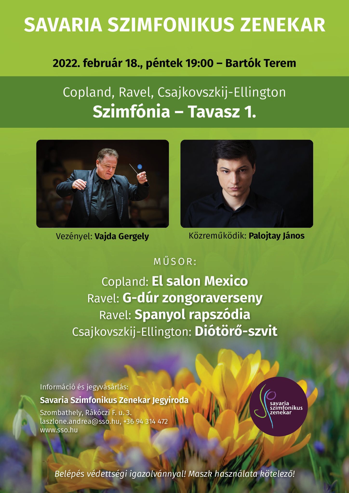 Különleges, tavaszi hangulatú hangversenyekkel várja zeneszerető közönségét a Savaria Szimfonikus Zenekar a Szimfónia-Tavasz bérlet előadásain. Február 18-án négy rendkívül izgalmas művel indul a bérletsorozat, melyen Copland, Ravel és Csajkovszkij-Ellington darabokat hallhat a közönség. Vezényel Vajda Gergely, zongorán közreműködik Palojtay János zongoraművész.