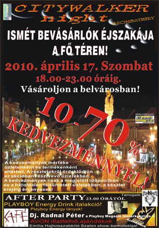 Lenne kedved napnyugta után a belvárosi üzleteket járni és SZÓRAKOZVA SOK AJÁNDÉKKAL a kezedbe vásárolni. MEGTEHETED! Amikor már a legtöbb üzlet bezárt végigjárhatod a CityWalker Night akcióban résztvevő belvárosi üzleteket. Ez az este nem csak azért izgalmas, mert az üzletek tovább (21.00, 22.00 óráig) tartanak nyitva és 10 - 70 %-os kedvezményeket kínálnak, hanem azért is mert néhányan különböző ajándékokkal, kedvességekkel, programokkal várnak!