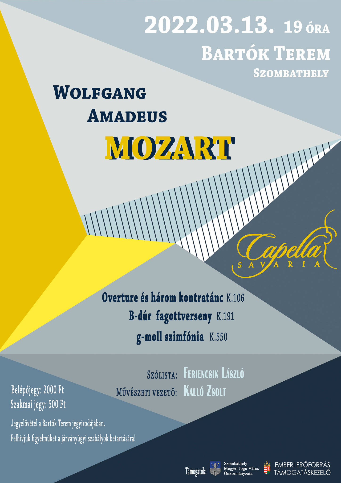 Március 13-án Mozart-estjére várja a zenebarátokat a Capella Savaria. A vasárnap esti hangversenyen három W. A. Mozart mű hangzik el - Overture és három kontratánc K.106, B-dúr fagottverseny K.191, g-moll szimfónia K.550.